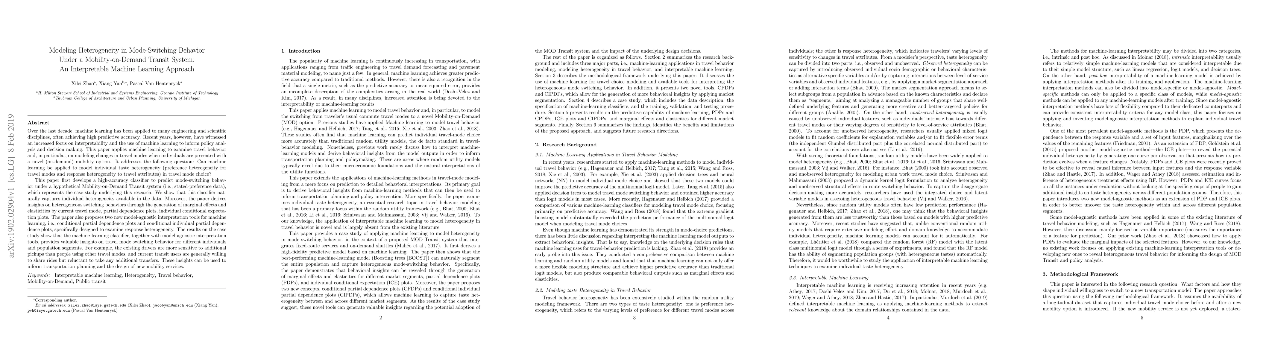 Recent years have witnessed an increased focus on interpretability and the use of machine learning to inform policy analysis and decision making. This paper applies machine learning to examine travel behavior and, in particular, on modeling changes in travel modes when individuals are presented with a novel (on-demand) mobility option. It addresses the following question: Can machine learning be applied to model individual taste heterogeneity (preference heterogeneity for travel modes and response heterogeneity to travel attributes) in travel mode choice? This paper first develops a high-accuracy classifier to predict mode-switching behavior under a hypothetical Mobility-on-Demand Transit system (i.e., stated-preference data), which represents the case study underlying this research. We show that this classifier naturally captures individual heterogeneity available in the data. Moreover, the paper derives insights on heterogeneous switching behaviors through the generation of marginal effects and elasticities by current travel mode, partial dependence plots, and individual conditional expectation plots. The paper also proposes two new model-agnostic interpretation tools for machine learning, i.e., conditional partial dependence plots and conditional individual partial dependence plots, specifically designed to examine response heterogeneity. The results on the case study show that the machine-learning classifier, together with model-agnostic interpretation tools, provides valuable insights on travel mode switching behavior for different individuals and population segments. For example, the existing drivers are more sensitive to additional pickups than people using other travel modes, and current transit users are generally willing to share rides but reluctant to take any additional transfers.
