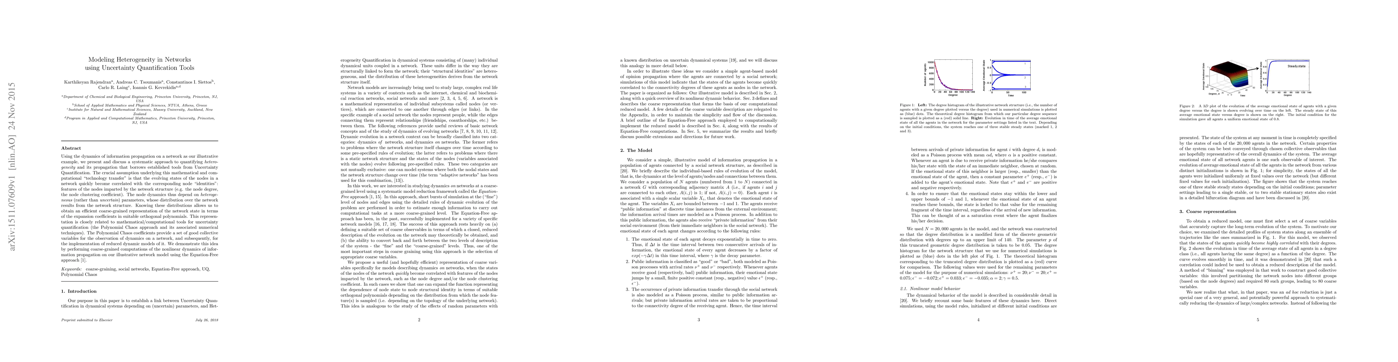 Using the dynamics of information propagation on a network as our illustrative example, we present and discuss a systematic approach to quantifying heterogeneity and its propagation that borrows established tools from Uncertainty Quantification. The crucial assumption underlying this mathematical and computational "technology transfer" is that the evolving states of the nodes in a network quickly become correlated with the corresponding node "identities": features of the nodes imparted by the network structure (e.g. the node degree, the node clustering coefficient). The node dynamics thus depend on heterogeneous (rather than uncertain) parameters, whose distribution over the network results from the network structure. Knowing these distributions allows us to obtain an efficient coarse-grained representation of the network state in terms of the expansion coefficients in suitable orthogonal polynomials. This representation is closely related to mathematical/computational tools for uncertainty quantification (the Polynomial Chaos approach and its associated numerical techniques). The Polynomial Chaos coefficients provide a set of good collective variables for the observation of dynamics on a network, and subsequently, for the implementation of reduced dynamic models of it. We demonstrate this idea by performing coarse-grained computations of the nonlinear dynamics of information propagation on our illustrative network model using the Equation-Free approach