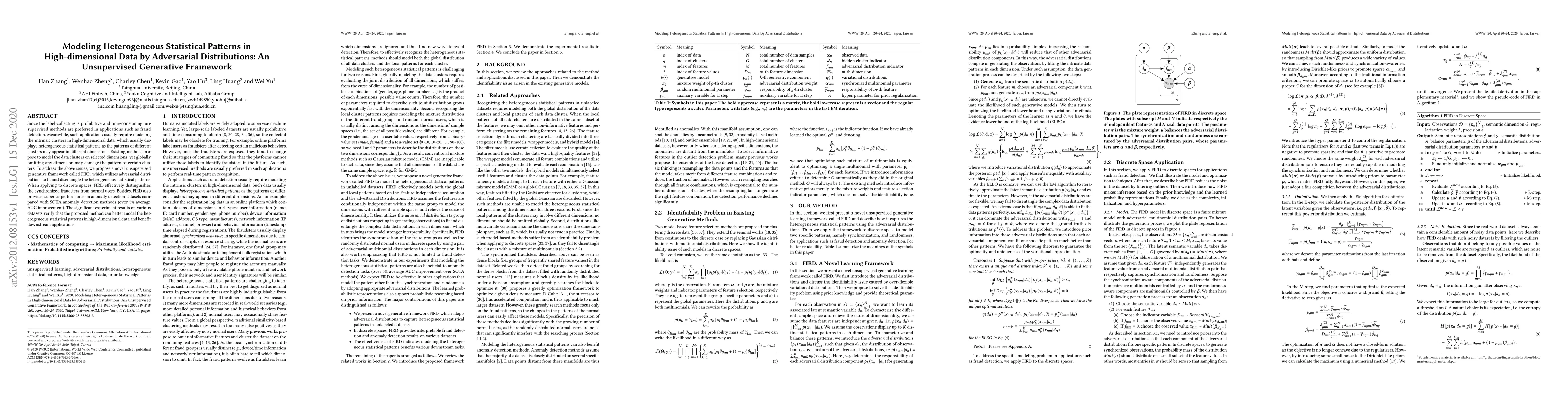 Since the label collecting is prohibitive and time-consuming, unsupervised methods are preferred in applications such as fraud detection. Meanwhile, such applications usually require modeling the intrinsic clusters in high-dimensional data, which usually displays heterogeneous statistical patterns as the patterns of different clusters may appear in different dimensions. Existing methods propose to model the data clusters on selected dimensions, yet globally omitting any dimension may damage the pattern of certain clusters. To address the above issues, we propose a novel unsupervised generative framework called FIRD, which utilizes adversarial distributions to fit and disentangle the heterogeneous statistical patterns. When applying to discrete spaces, FIRD effectively distinguishes the synchronized fraudsters from normal users. Besides, FIRD also provides superior performance on anomaly detection datasets compared with SOTA anomaly detection methods (over 5% average AUC improvement). The significant experiment results on various datasets verify that the proposed method can better model the heterogeneous statistical patterns in high-dimensional data and benefit downstream applications.