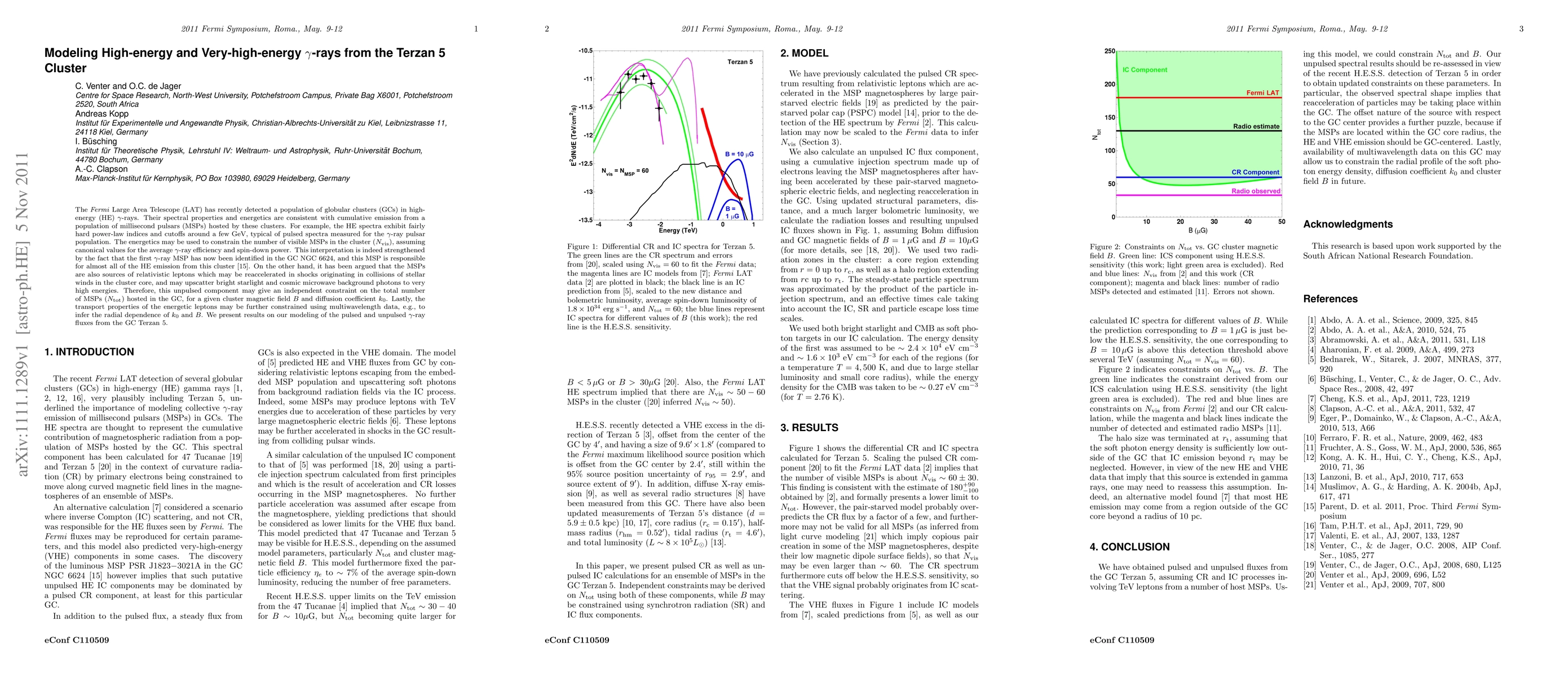 A study models gamma-ray emissions from a globular cluster, Terzan 5, suggesting it comes from millisecond pulsars hosted in the cluster, with implications for constraining the number of visible pulsars and understanding their role in producing high-energy particles.