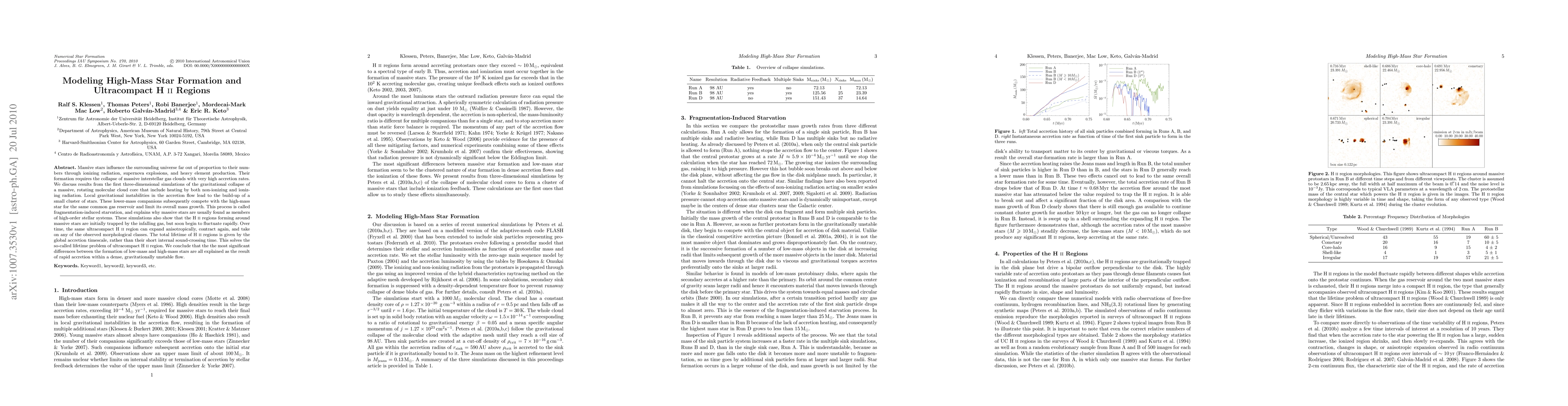 Massive stars influence the surrounding universe far out of proportion to their numbers through ionizing radiation, supernova explosions, and heavy element production. Their formation requires the collapse of massive interstellar gas clouds with very high accretion rates. We discuss results from the first three-dimensional simulations of the gravitational collapse of a massive, rotating molecular cloud core that include heating by both non-ionizing and ionizing radiation. Local gravitational instabilities in the accretion flow lead to the build-up of a small cluster of stars. These lower-mass companions subsequently compete with the high-mass star for the same common gas reservoir and limit its overall mass growth. This process is called fragmentation-induced starvation, and explains why massive stars are usually found as members of high-order stellar systems. These simulations also show that the HII regions forming around massive stars are initially trapped by the infalling gas, but soon begin to fluctuate rapidly. Over time, the same ultracompact HII region can expand anisotropically, contract again, and take on any of the observed morphological classes. The total lifetime of HII regions is given by the global accretion timescale, rather than their short internal sound-crossing time. This solves the so-called lifetime problem of ultracompact HII region. We conclude that the the most significant differences between the formation of low-mass and high-mass stars are all explained as the result of rapid accretion within a dense, gravitationally unstable flow.