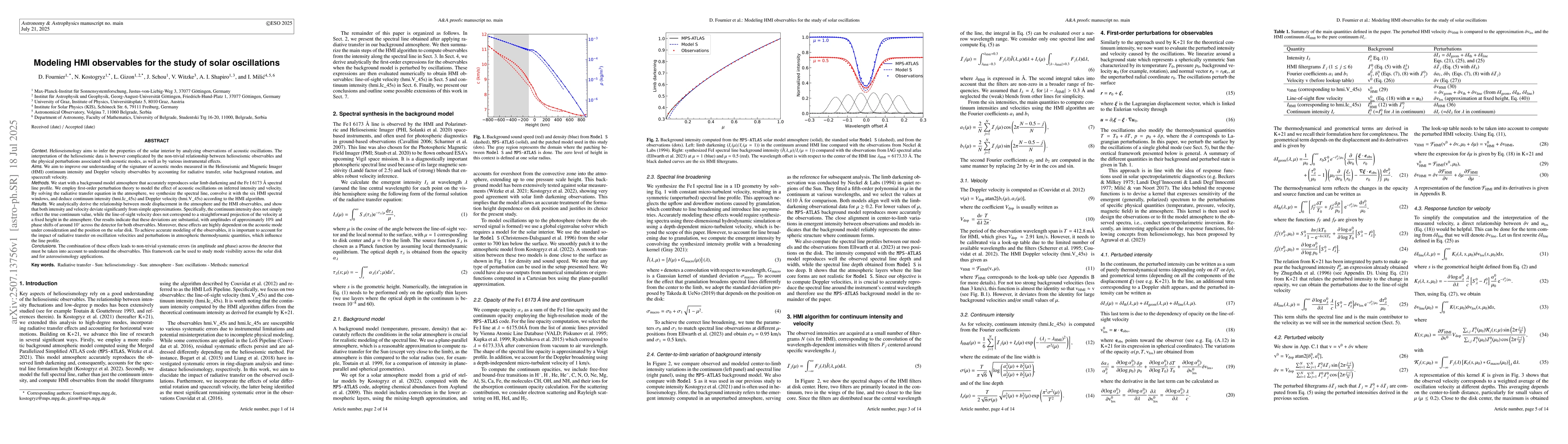 Context: Helioseismology aims to infer the properties of the solar interior by analyzing observations of acoustic oscillations. The interpretation of the helioseismic data is however complicated by the non-trivial relationship between helioseismic observables and the physical perturbations associated with acoustic modes, as well as by various instrumental effects. Aims: We aim to improve our understanding of the signature of acoustic modes measured in the Helioseismic and Magnetic Imager (HMI) continuum intensity and Doppler velocity observables by accounting for radiative transfer, solar background rotation, and spacecraft velocity. Methods: We start with a background model atmosphere that accurately reproduces solar limb darkening and the Fe I 6173{\AA} spectral line profile. We employ first-order perturbation theory to model the effect of acoustic oscillations on inferred intensity and velocity. By solving the radiative transfer equation in the atmosphere, we synthesize the spectral line, convolve it with the six HMI spectral windows, and deduce continuum intensity (hmi.Ic_45s) and Doppler velocity (hmi.V_45s) according to the HMI algorithm. Results: We analytically derive the relationship between mode displacement in the atmosphere and the HMI observables, and show that both intensity and velocity deviate significantly from simple approximations. Specifically, the continuum intensity does not simply reflect the true continuum value, while the line-of-sight velocity does not correspond to a straightforward projection of the velocity at a fixed height in the atmosphere. Our results indicate that these deviations are substantial, with amplitudes of approximately 10% and phase shifts of around 10 degrees across the detector for both observables. Moreover, these effects are highly dependent on the acoustic mode under consideration and the position on the solar disk.