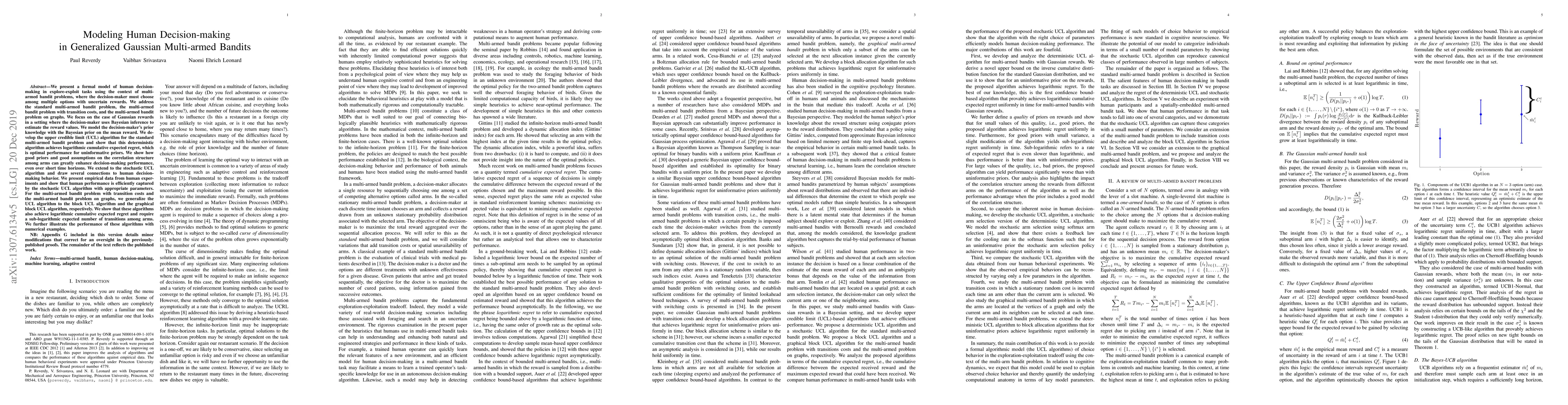 This paper models human decision-making in explore-exploit tasks using multi-armed bandit problems, developing algorithms like UCL and stochastic UCL that capture human behavior. The study shows these algorithms achieve optimal performance and generalizes them to handle transition costs and graph-based structures.