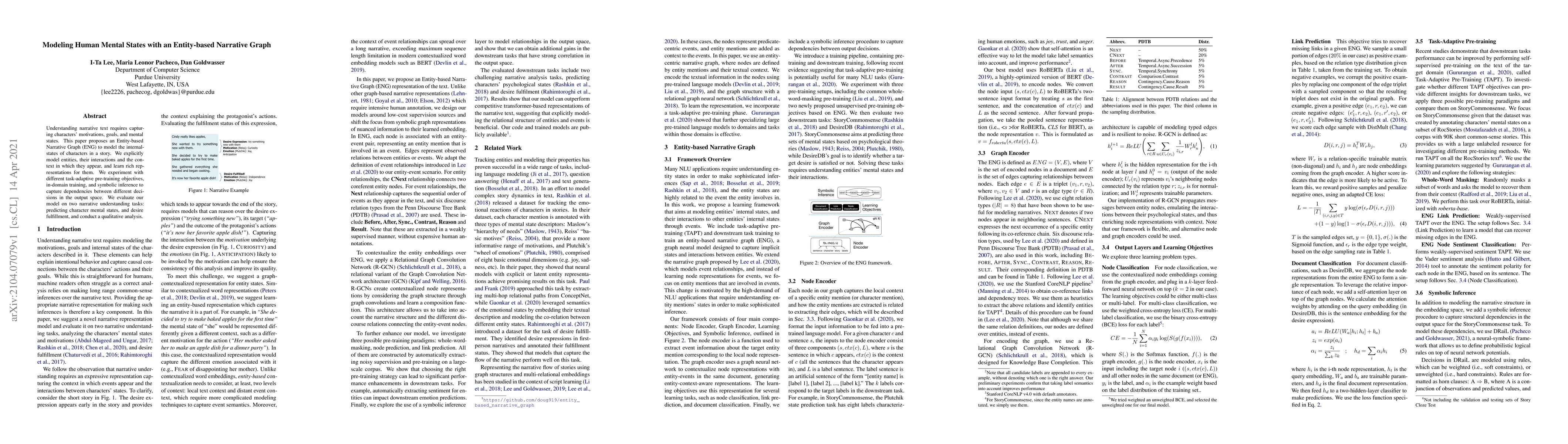 Understanding narrative text requires capturing characters' motivations, goals, and mental states. This paper proposes an Entity-based Narrative Graph (ENG) to model the internal-states of characters in a story. We explicitly model entities, their interactions and the context in which they appear, and learn rich representations for them. We experiment with different task-adaptive pre-training objectives, in-domain training, and symbolic inference to capture dependencies between different decisions in the output space. We evaluate our model on two narrative understanding tasks: predicting character mental states, and desire fulfillment, and conduct a qualitative analysis.