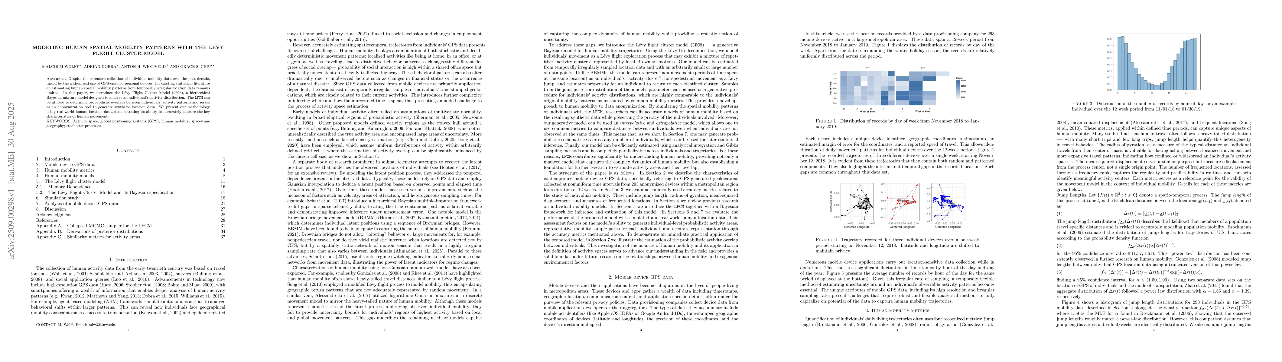Despite the extensive collection of individual mobility data over the past decade, fueled by the widespread use of GPS-enabled personal devices, the existing statistical literature on estimating human spatial mobility patterns from temporally irregular location data remains limited. In this paper, we introduce the L\'{e}vy Flight Cluster Model (LFCM), a hierarchical Bayesian mixture model designed to analyze an individual's activity distribution. The LFCM can be utilized to determine probabilistic overlaps between individuals' activity patterns and serves as an anonymization tool to generate synthetic location data. We present our methodology using real-world human location data, demonstrating its ability to accurately capture the key characteristics of human movement.
