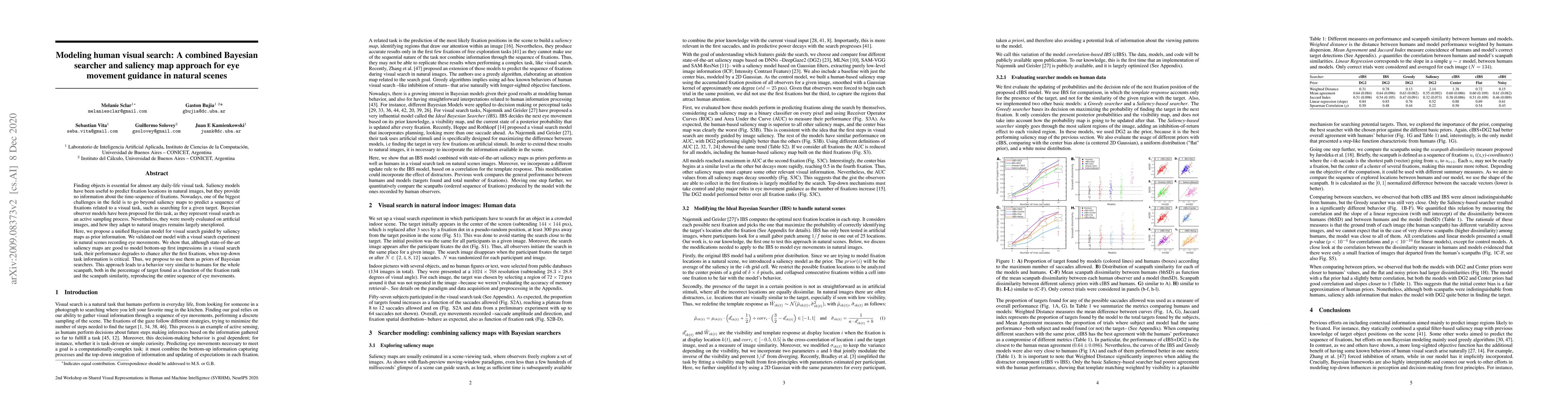 Finding objects is essential for almost any daily-life visual task. Saliency models have been useful to predict fixation locations in natural images, but are static, i.e., they provide no information about the time-sequence of fixations. Nowadays, one of the biggest challenges in the field is to go beyond saliency maps to predict a sequence of fixations related to a visual task, such as searching for a given target. Bayesian observer models have been proposed for this task, as they represent visual search as an active sampling process. Nevertheless, they were mostly evaluated on artificial images, and how they adapt to natural images remains largely unexplored. Here, we propose a unified Bayesian model for visual search guided by saliency maps as prior information. We validated our model with a visual search experiment in natural scenes recording eye movements. We show that, although state-of-the-art saliency models perform well in predicting the first two fixations in a visual search task, their performance degrades to chance afterward. This suggests that saliency maps alone are good to model bottom-up first impressions, but are not enough to explain the scanpaths when top-down task information is critical. Thus, we propose to use them as priors of Bayesian searchers. This approach leads to a behavior very similar to humans for the whole scanpath, both in the percentage of target found as a function of the fixation rank and the scanpath similarity, reproducing the entire sequence of eye movements.