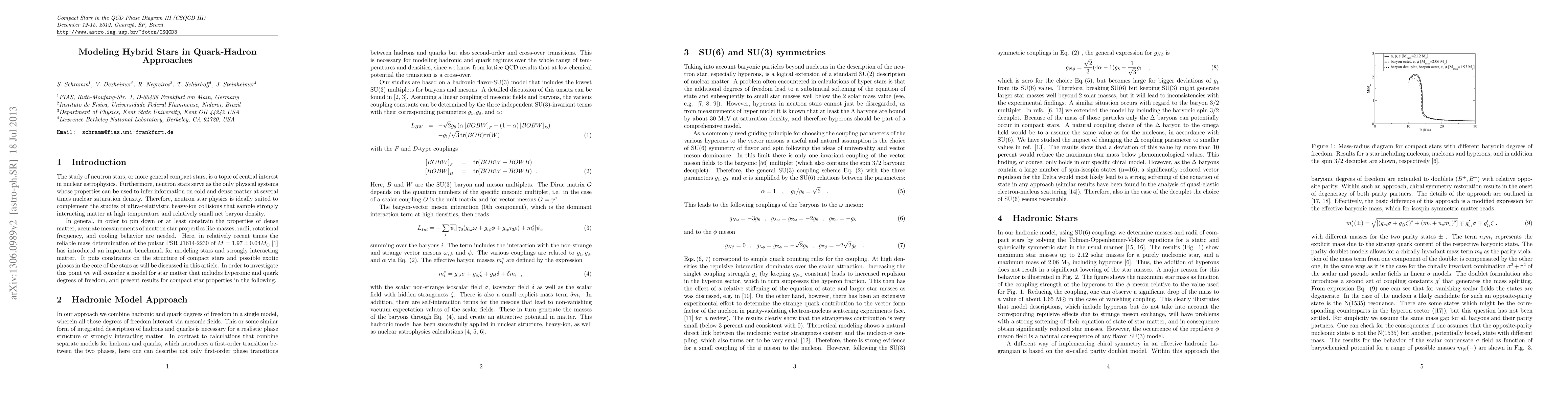 The study of neutron stars, or more general compact stars, is a topic of central interest in nuclear astrophysics. Furthermore, neutron stars serve as the only physical systems whose properties can be used to infer information on cold and dense matter at several times nuclear saturation density. Therefore, neutron star physics is ideally suited to complement the studies of ultra-relativistic heavy-ion collisions that sample strongly interacting matter at high temperature and relatively small net baryon density. In general, in order to pin down or at least constrain the properties of dense matter, accurate measurements of neutron star properties like masses, radii, rotational frequency, and cooling behavior are needed. Here, in relatively recent times the reliable mass determination of the pulsar PSR J1614-2230 of $M = 1.97 \pm 0.04 M_\odot$ has introduced an important benchmark for modeling stars and strongly interacting matter. It puts constraints on the structure of compact stars and possible exotic phases in the core of the stars as will be discussed in this article. In order to investigate this point we will consider a model for star matter that includes hyperonic and quark degrees of freedom, and present results for compact star properties in the following.