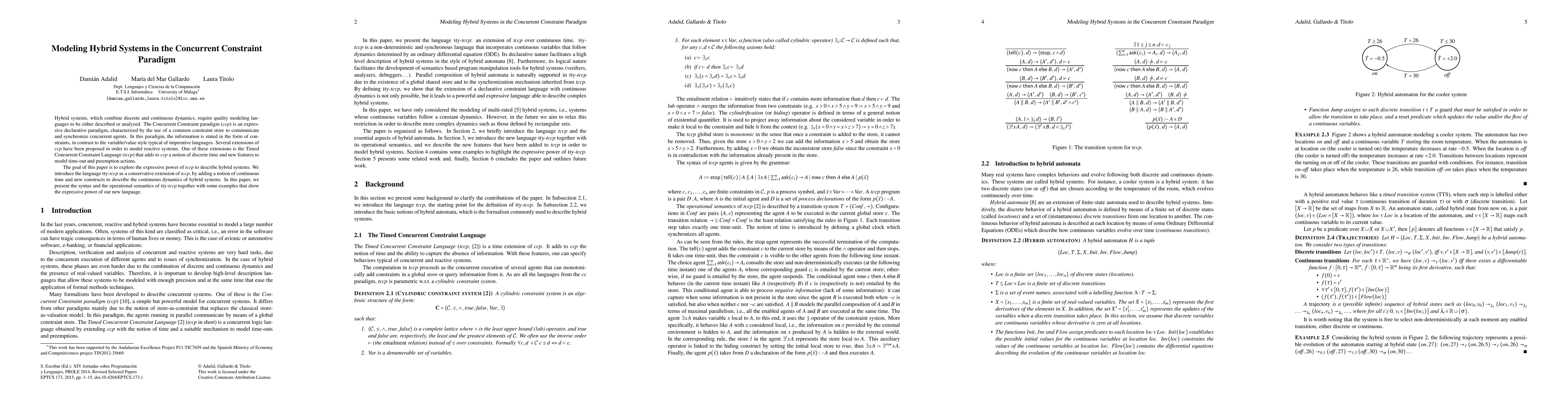 Hybrid systems, which combine discrete and continuous dynamics, require quality modeling languages to be either described or analyzed. The Concurrent Constraint paradigm (ccp) is an expressive declarative paradigm, characterized by the use of a common constraint store to communicate and synchronize concurrent agents. In this paradigm, the information is stated in the form of constraints, in contrast to the variable/value style typical of imperative languages. Several extensions of ccp have been proposed in order to model reactive systems. One of these extensions is the Timed Concurrent Constraint Language (tccp) that adds to ccp a notion of discrete time and new features to model time-out and preemption actions. The goal of this paper is to explore the expressive power of tccp to describe hybrid systems. We introduce the language Hy-tccp as a conservative extension of tccp, by adding a notion of continuous time and new constructs to describe the continuous dynamics of hybrid systems. In this paper, we present the syntax and the operational semantics of Hy-tccp together with some examples that show the expressive power of our new language.