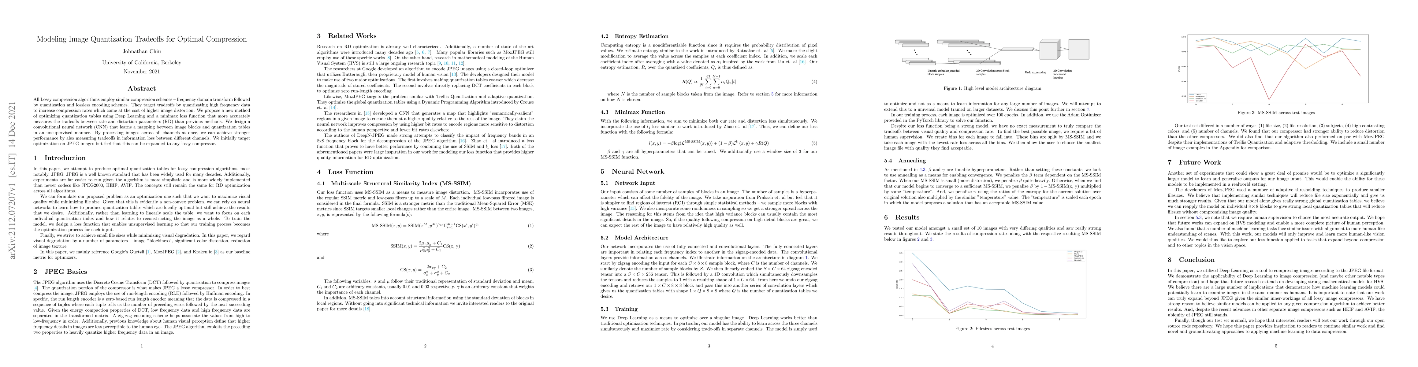 This paper proposes a novel deep learning approach to optimize image quantization for lossy compression, using a convolutional neural network to learn mappings between image blocks and quantization tables. The method aims to better balance rate and distortion tradeoffs by measuring information loss across all image channels simultaneously.