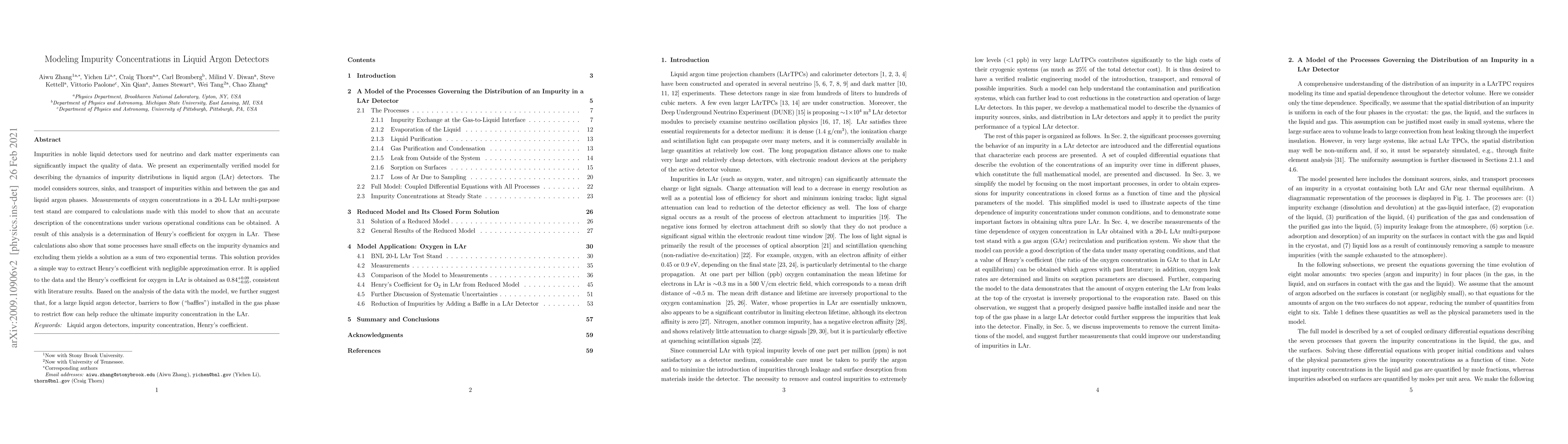 Impurities in noble liquid detectors used for neutrino and dark matter experiments can significantly impact the quality of data. We present an experimentally verified model for describing the dynamics of impurity distributions in liquid argon (LAr) detectors. The model considers sources, sinks, and transport of impurities within and between the gas and liquid argon phases. Measurements of oxygen concentrations in a 20-L LAr multi-purpose test stand are compared to calculations made with this model to show that an accurate description of the concentrations under various operational conditions can be obtained. A result of this analysis is a determination of Henry's coefficient for oxygen in LAr. These calculations also show that some processes have small effects on the impurity dynamics and excluding them yields a solution as a sum of two exponential terms. This solution provides a simple way to extract Henry's coefficient with negligible approximation error. It is applied to the data and the Henry's coefficient for oxygen in LAr is obtained as 0.84$^{+0.09}_{-0.05}$, consistent with literature results. Based on the analysis of the data with the model, we further suggest that, for a large liquid argon detector, barriers to flow ("baffles") installed in the gas phase to restrict flow can help reduce the ultimate impurity concentration in the LAr.