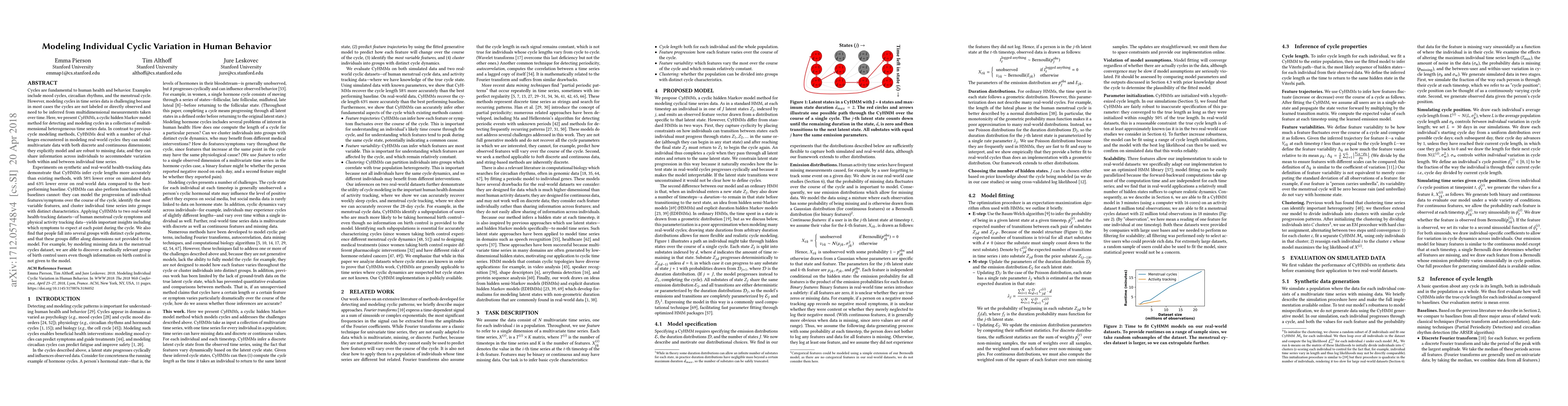 CyHMMs is a cyclic hidden Markov model for detecting and modeling cycles in multidimensional time series data, demonstrating superior accuracy in inferring cycle lengths compared to existing methods. The model can handle multivariate data, missing values, and individual variations, providing insights into health-tracking patterns and identifying distinct cycle patterns among individuals.