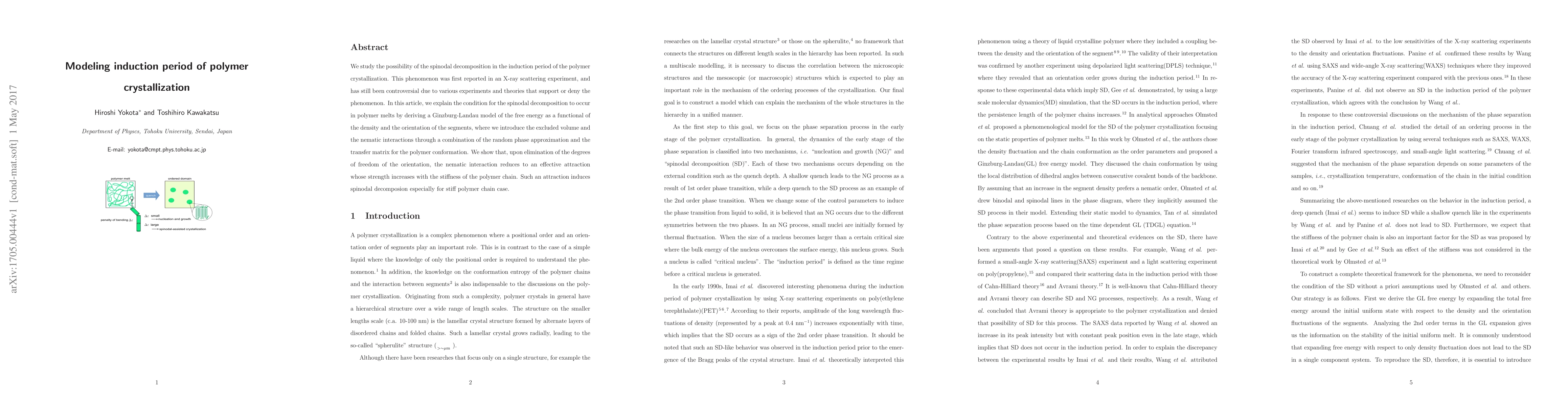This paper models the induction period of polymer crystallization, focusing on spinodal decomposition. It derives a Ginzburg-Landau model incorporating excluded volume and nematic interactions, showing that effective attraction from nematic interactions, especially for stiff polymer chains, induces spinodal decomposition.