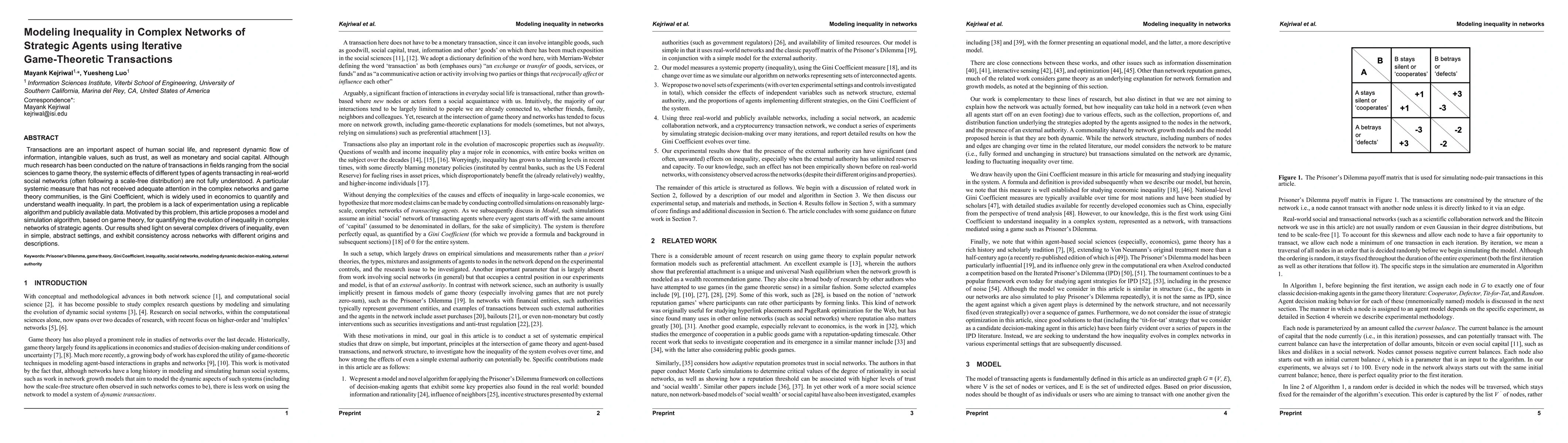 The research proposes a model and simulation algorithm based on game theory to quantify the evolution of inequality in complex networks of strategic agents, using iterative transactions.