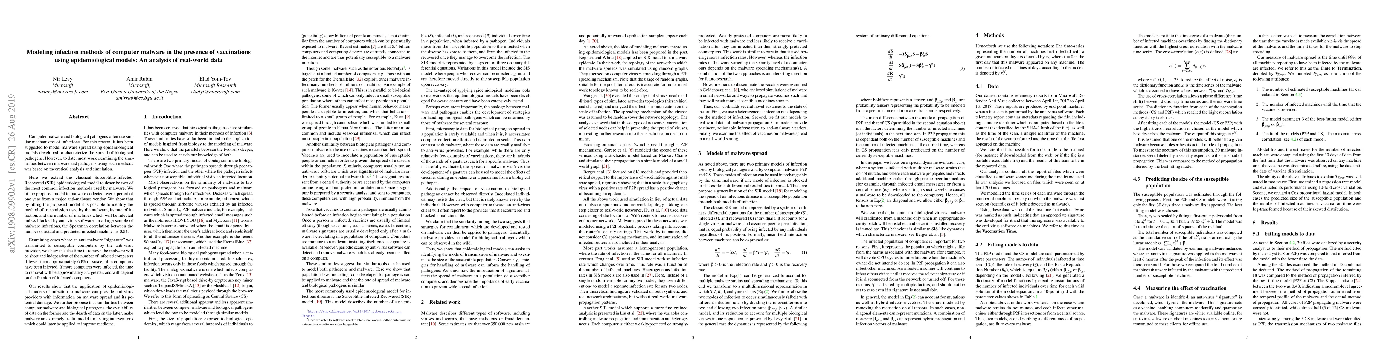 This paper extends the SIR epidemiological model to analyze computer malware infection methods using real-world data. It demonstrates that fitting the model to malware data can reveal infection methods, rates, and potential spread, with a high correlation (0.84) between predicted and actual infections. The study also shows that "vaccinations" via anti-malware signatures significantly reduce infection duration if less than 60% of computers are infected.
