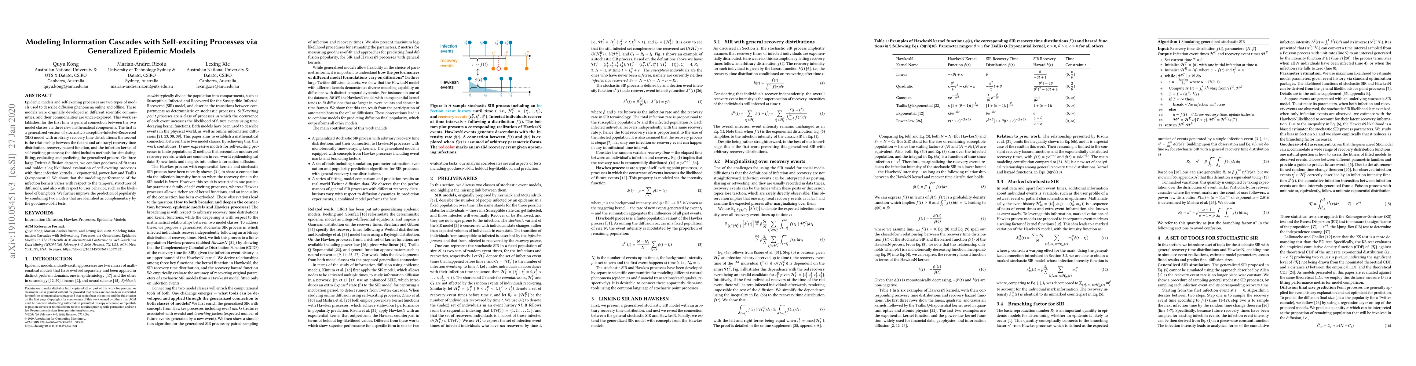 This paper connects epidemic models and self-exciting processes through a generalized SIR model, recovery time distributions, and infection kernels. It demonstrates varying modeling performance of different kernels based on Twitter diffusion data and improves popularity prediction by combining complementary models.