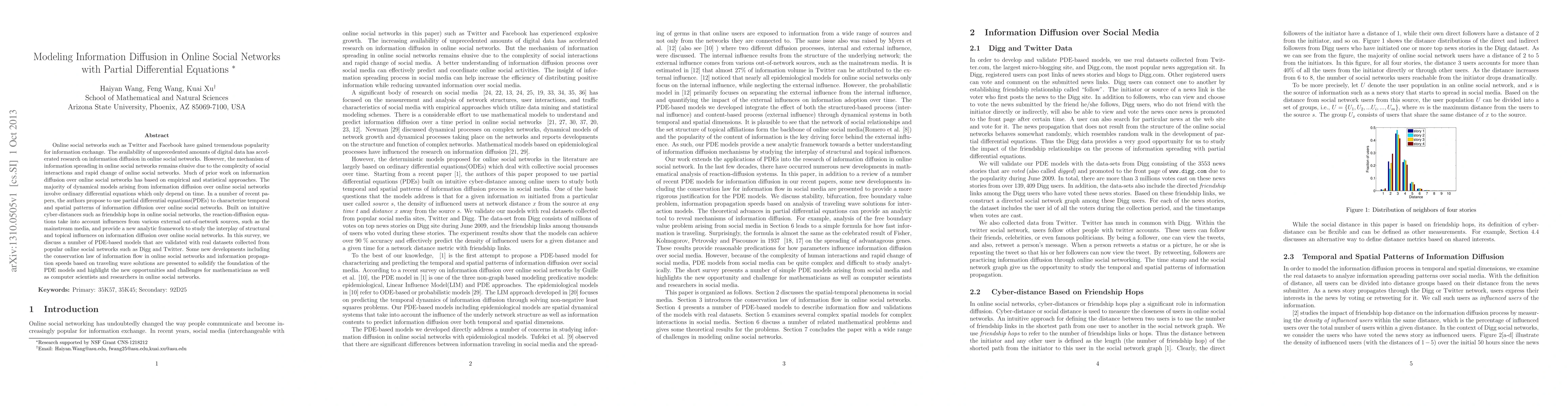 Online social networks such as Twitter and Facebook have gained tremendous popularity for information exchange. The availability of unprecedented amounts of digital data has accelerated research on information diffusion in online social networks. However, the mechanism of information spreading in online social networks remains elusive due to the complexity of social interactions and rapid change of online social networks. Much of prior work on information diffusion over online social networks has based on empirical and statistical approaches. The majority of dynamical models arising from information diffusion over online social networks involve ordinary differential equations which only depend on time. In a number of recent papers, the authors propose to use partial differential equations(PDEs) to characterize temporal and spatial patterns of information diffusion over online social networks. Built on intuitive cyber-distances such as friendship hops in online social networks, the reaction-diffusion equations take into account influences from various external out-of-network sources, such as the mainstream media, and provide a new analytic framework to study the interplay of structural and topical influences on information diffusion over online social networks. In this survey, we discuss a number of PDE-based models that are validated with real datasets collected from popular online social networks such as Digg and Twitter. Some new developments including the conservation law of information flow in online social networks and information propagation speeds based on traveling wave solutions are presented to solidify the foundation of the PDE models and highlight the new opportunities and challenges for mathematicians as well as computer scientists and researchers in online social networks.