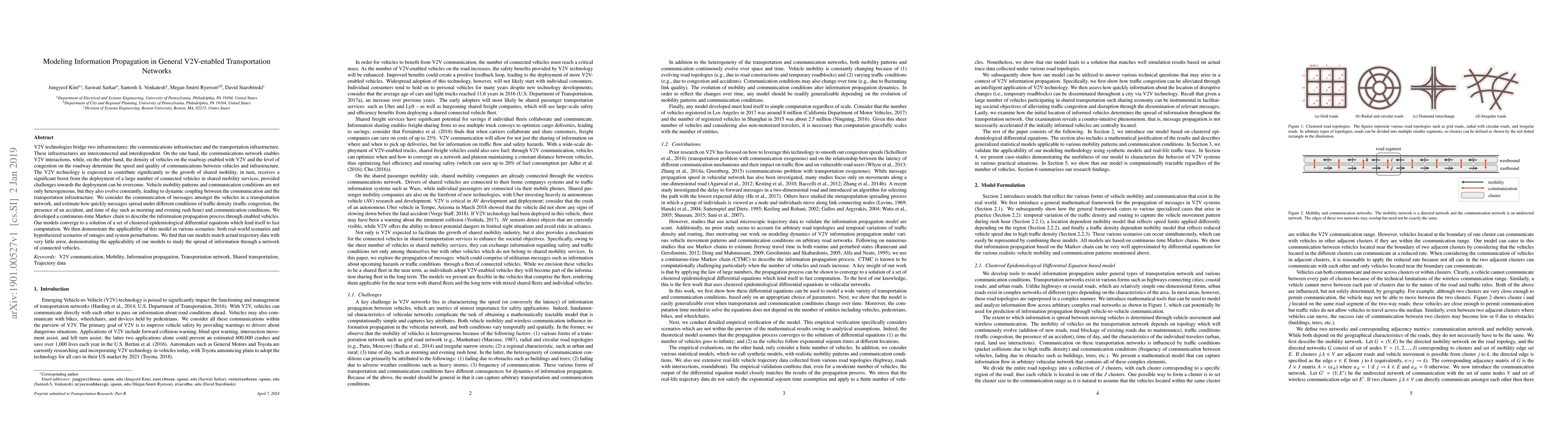 V2V technologies bridge two infrastructures: the communications infrastructure and the transportation infrastructure. These infrastructures are interconnected and interdependent. On the one hand, the communications network enables V2V interactions, while, on the other hand, the density of vehicles on the roadway enabled with V2V and the level of congestion on the roadway determine the speed and quality of communications between vehicles and infrastructure. The V2V technology is expected to contribute significantly to the growth of shared mobility, in turn, receives a significant boost from the deployment of a large number of connected vehicles in shared mobility services, provided challenges towards the deployment can be overcome. Vehicle mobility patterns and communication conditions are not only heterogeneous, but they also evolve constantly, leading to dynamic coupling between the communication and the transportation infrastructure. We consider the communication of messages amongst the vehicles in a transportation network, and estimate how quickly messages spread under different conditions of traffic density (traffic congestion, the presence of an accident, and time of day such as morning and evening rush hour) and communication conditions. We developed a continuous-time Markov chain to describe the information propagation process through enabled vehicles. Our models converge to a solution of a set of clustered epidemiological differential equations which lend itself to fast computation. We then demonstrate the applicability of this model in various scenarios: both real-world scenarios and hypothesized scenarios of outages and system perturbations. We find that our models match actual trajectory data with very little error, demonstrating the applicability of our models to study the spread of information through a network of connected vehicles.