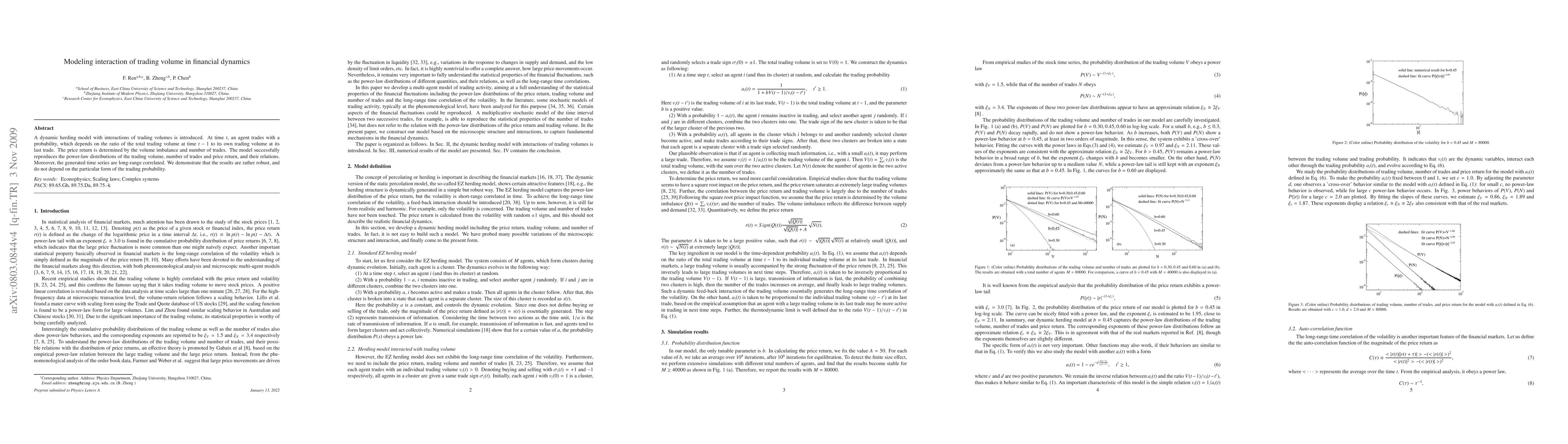 A dynamic herding model with interactions of trading volumes is introduced. At time $t$, an agent trades with a probability, which depends on the ratio of the total trading volume at time $t-1$ to its own trading volume at its last trade. The price return is determined by the volume imbalance and number of trades. The model successfully reproduces the power-law distributions of the trading volume, number of trades and price return, and their relations. Moreover, the generated time series are long-range correlated. We demonstrate that the results are rather robust, and do not depend on the particular form of the trading probability.