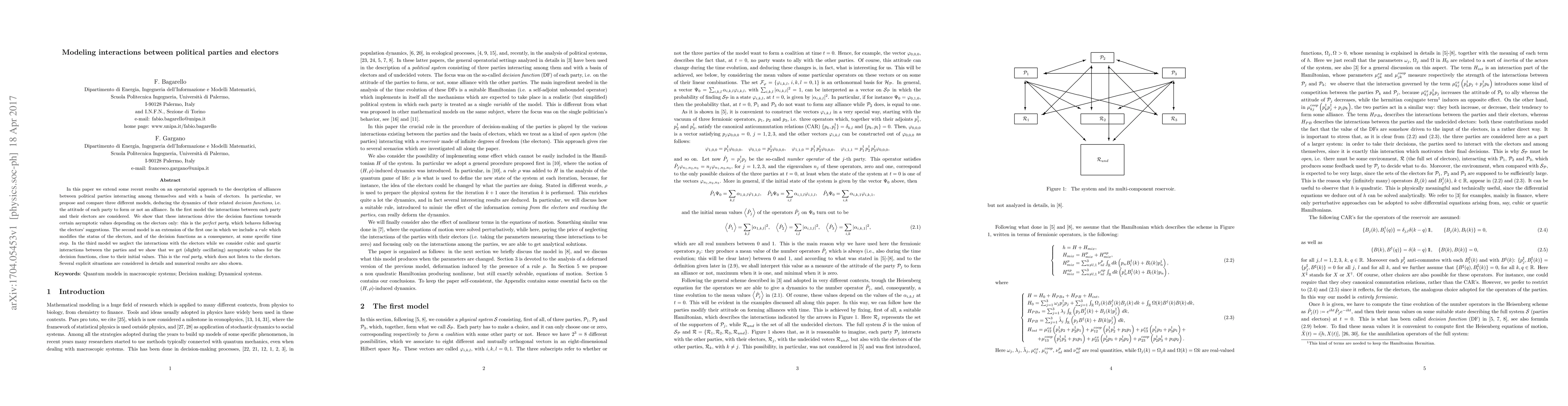 This paper models interactions between political parties and electors using three different approaches, finding that party behavior converges to an asymptotic value depending on their relationship with electors or remaining independent of them.