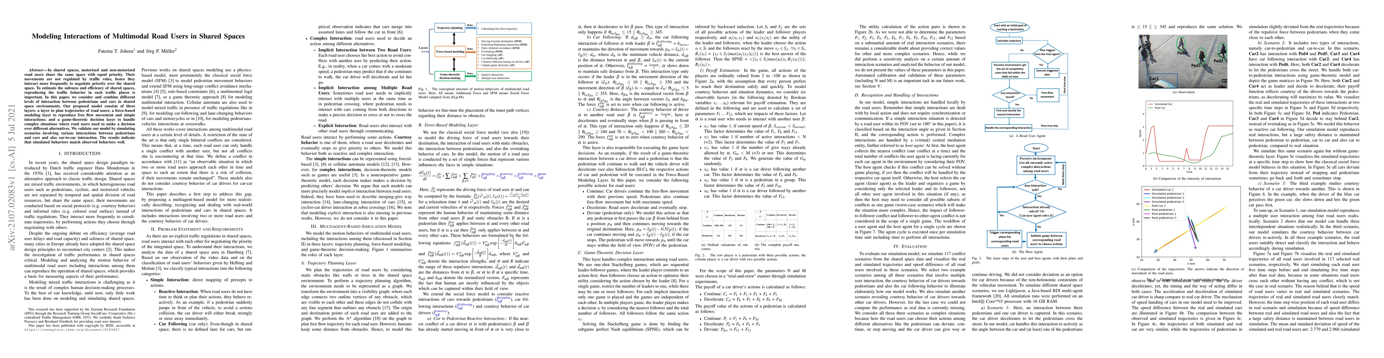 This paper proposes a three-layer model to simulate interactions between pedestrians and cars in shared spaces, focusing on trajectory planning, free flow movement, and complex decision-making. The model's effectiveness is validated through simulations that accurately replicate observed interactions.