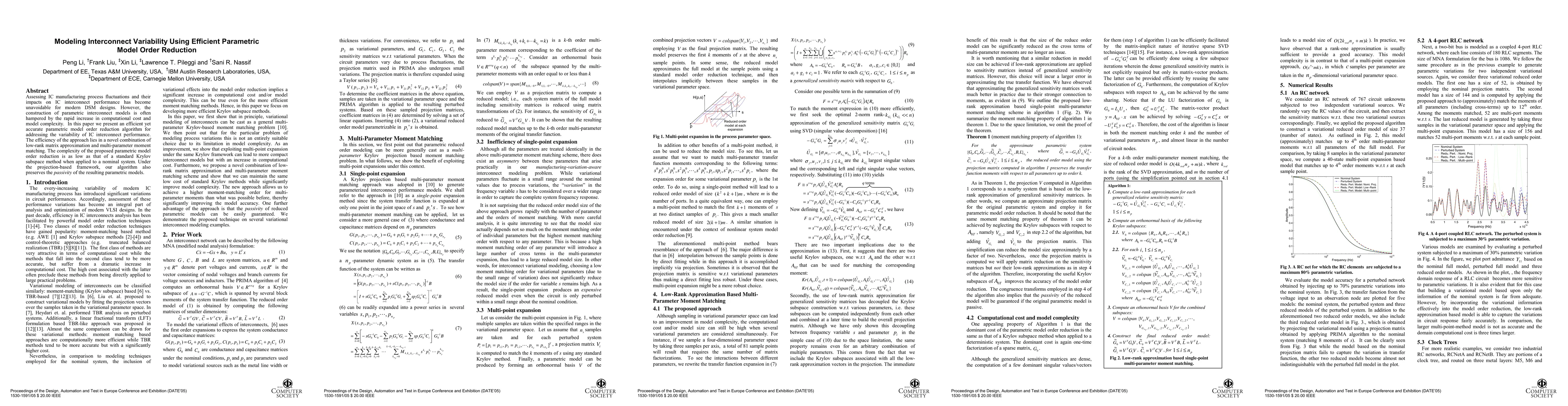 This paper introduces an efficient parametric model order reduction algorithm combining low-rank matrix approximation and multi-parameter moment matching to address variability in IC interconnect performance. The method maintains low computational complexity and preserves passivity in the resulting parametric models.