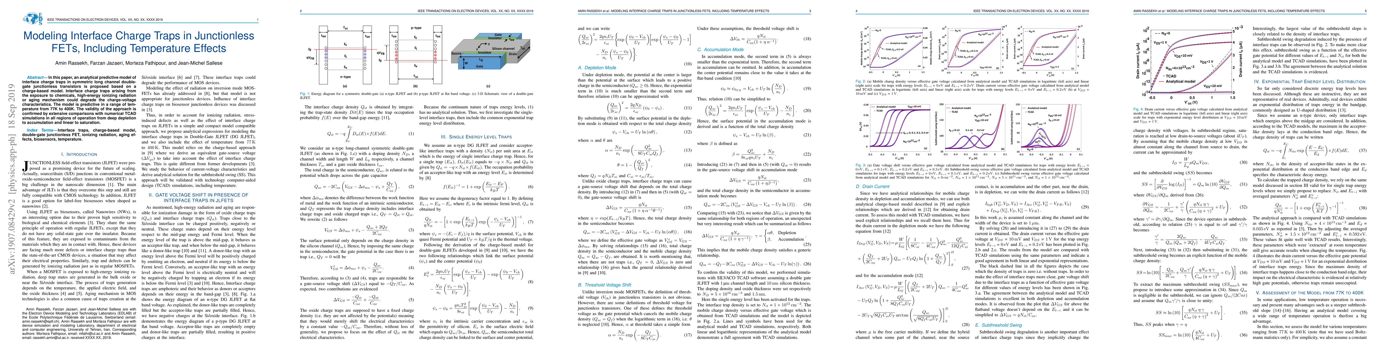 A predictive model for interface charge traps in junctionless FETs was developed, accounting for temperature effects, which accurately predicted results from TCAD simulations.