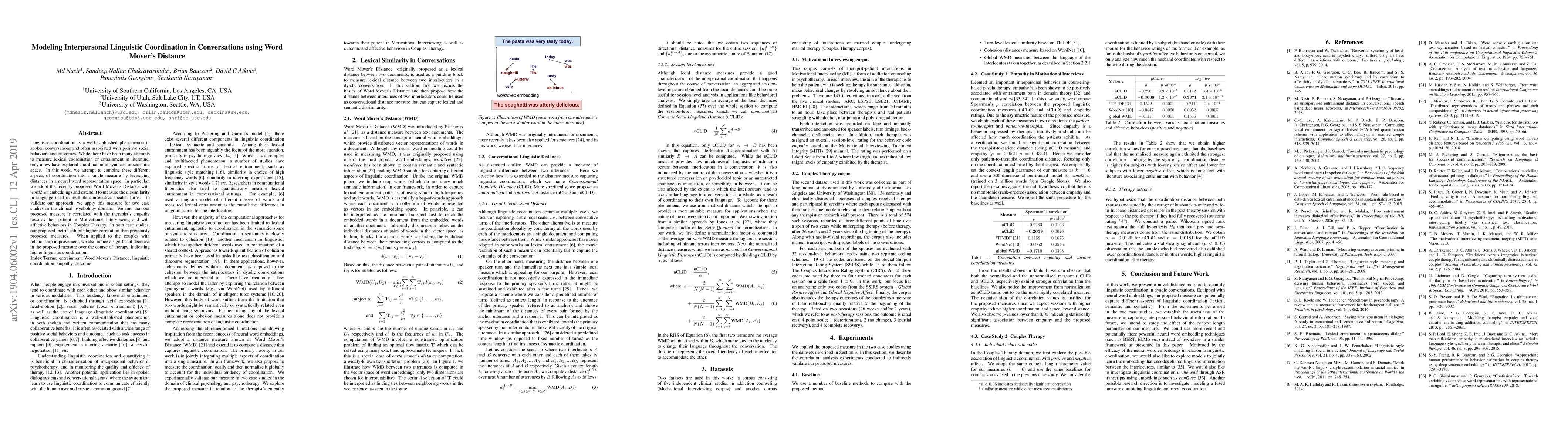 This paper proposes a novel measure using Word Mover's Distance in word2vec embeddings to quantify linguistic coordination in conversational exchanges, showing higher correlation with therapist empathy and affective behaviors in clinical psychology settings compared to existing measures. The method also indicates decreased coordination in couples therapy linked to relationship improvement.