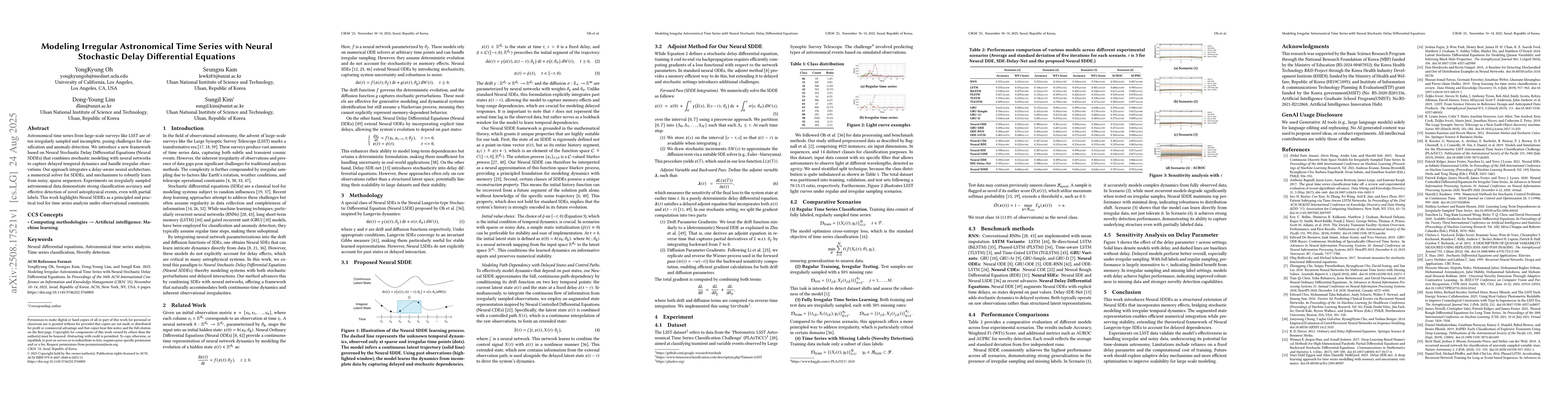 Astronomical time series from large-scale surveys like LSST are often irregularly sampled and incomplete, posing challenges for classification and anomaly detection. We introduce a new framework based on Neural Stochastic Delay Differential Equations (Neural SDDEs) that combines stochastic modeling with neural networks to capture delayed temporal dynamics and handle irregular observations. Our approach integrates a delay-aware neural architecture, a numerical solver for SDDEs, and mechanisms to robustly learn from noisy, sparse sequences. Experiments on irregularly sampled astronomical data demonstrate strong classification accuracy and effective detection of novel astrophysical events, even with partial labels. This work highlights Neural SDDEs as a principled and practical tool for time series analysis under observational constraints.