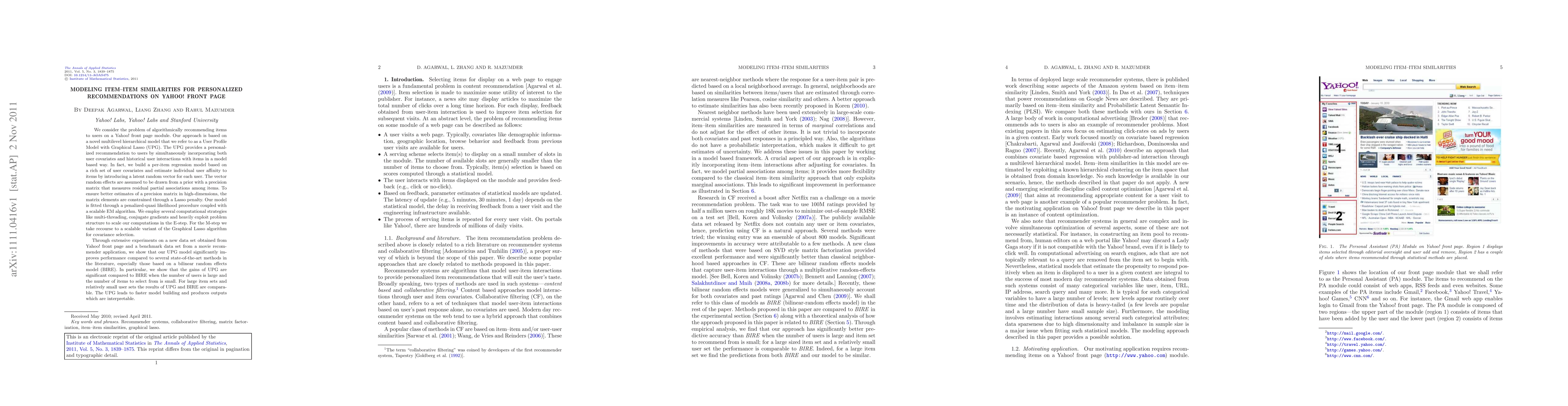 We consider the problem of algorithmically recommending items to users on a Yahoo! front page module. Our approach is based on a novel multilevel hierarchical model that we refer to as a User Profile Model with Graphical Lasso (UPG). The UPG provides a personalized recommendation to users by simultaneously incorporating both user covariates and historical user interactions with items in a model based way. In fact, we build a per-item regression model based on a rich set of user covariates and estimate individual user affinity to items by introducing a latent random vector for each user. The vector random effects are assumed to be drawn from a prior with a precision matrix that measures residual partial associations among items. To ensure better estimates of a precision matrix in high-dimensions, the matrix elements are constrained through a Lasso penalty. Our model is fitted through a penalized-quasi likelihood procedure coupled with a scalable EM algorithm. We employ several computational strategies like multi-threading, conjugate gradients and heavily exploit problem structure to scale our computations in the E-step. For the M-step we take recourse to a scalable variant of the Graphical Lasso algorithm for covariance selection. Through extensive experiments on a new data set obtained from Yahoo! front page and a benchmark data set from a movie recommender application, we show that our UPG model significantly improves performance compared to several state-of-the-art methods in the literature, especially those based on a bilinear random effects model (BIRE). In particular, we show that the gains of UPG are significant compared to BIRE when the number of users is large and the number of items to select from is small. For large item sets and relatively small user sets the results of UPG and BIRE are comparable. The UPG leads to faster model building and produces outputs which are interpretable.