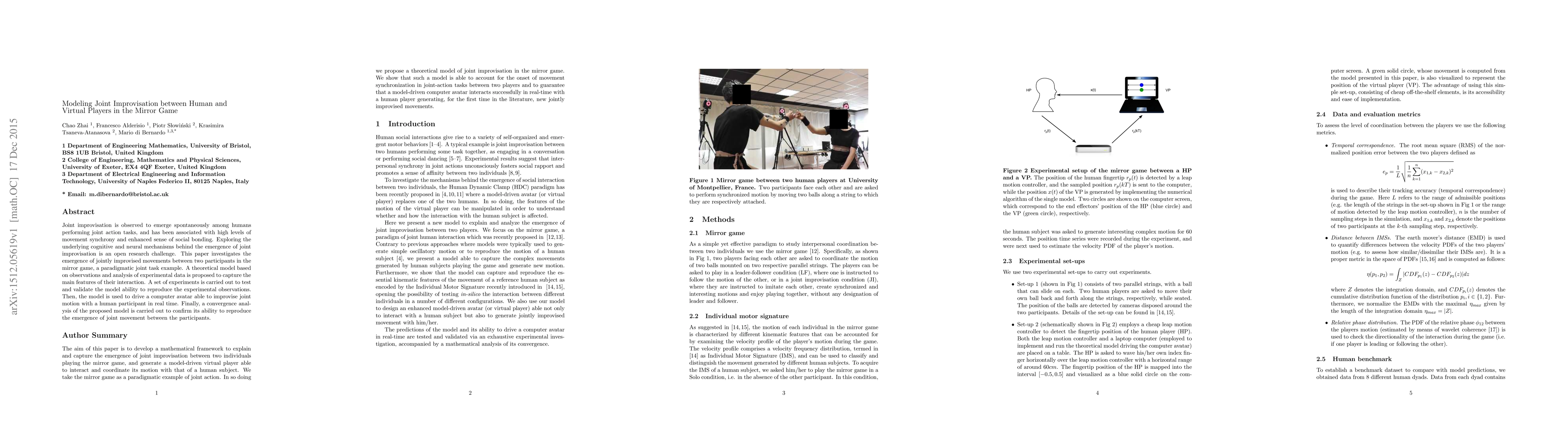 This paper proposes a theoretical model to capture the emergence of joint improvisation in the mirror game, validated through experiments, and used to drive a computer avatar for real-time interaction with human participants. The model's convergence analysis confirms its effectiveness in reproducing joint movement synchrony.