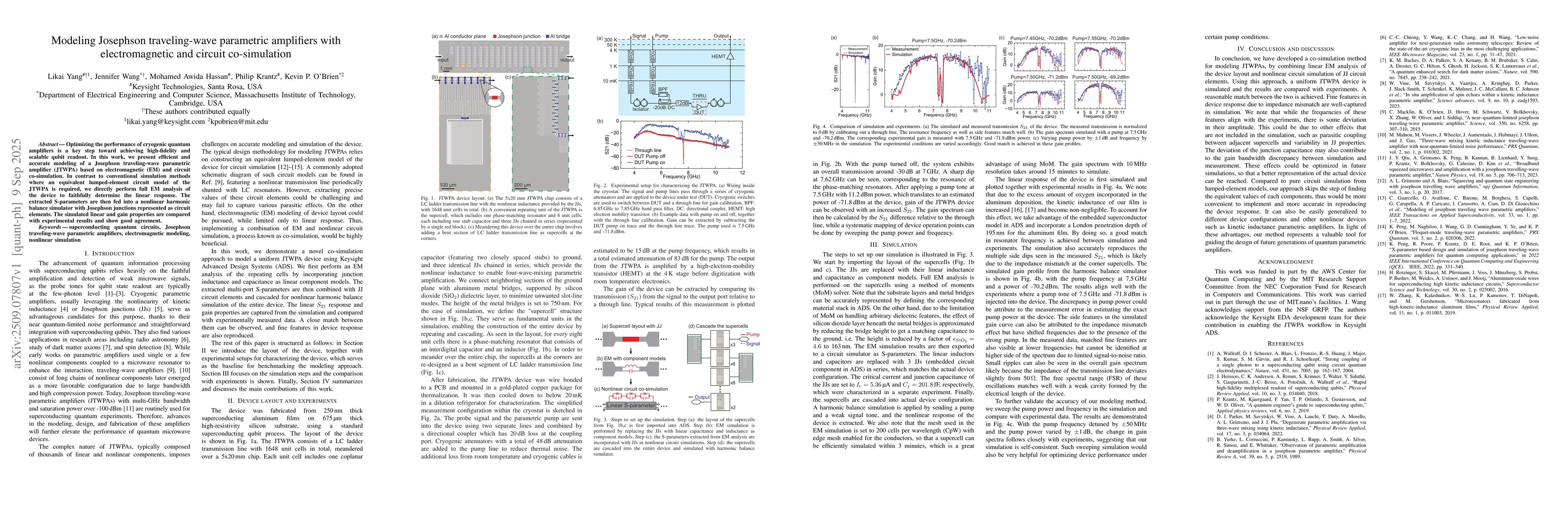 Optimizing the performance of cryogenic quantum amplifiers is a key step toward achieving high-fidelity and scalable qubit readout. In this work, we present efficient and accurate modeling of a Josephson traveling-wave parametric amplifier (JTWPA) based on electromagnetic (EM) and circuit co-simulation. In contrast to conventional simulation methods where an equivalent lumped-element circuit model of the JTWPA is required, we directly perform full EM analysis of the device to faithfully determine the linear response. The extracted S-parameters are then fed into a nonlinear harmonic balance simulator with Josephson junctions represented as circuit elements. The simulated linear and gain properties are compared with experimental results and show good agreement.
