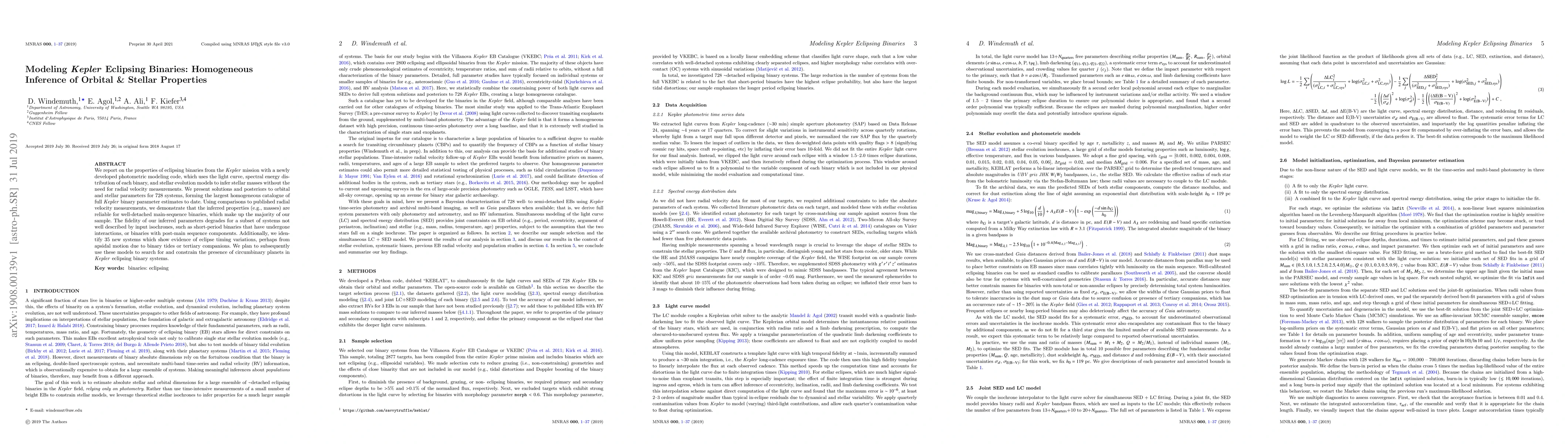 We report on the properties of eclipsing binaries from the Kepler mission with a newly developed photometric modeling code, which uses the light curve, spectral energy distribution of each binary, and stellar evolution models to infer stellar masses without the need for radial velocity measurements. We present solutions and posteriors to orbital and stellar parameters for 728 systems, forming the largest homogeneous catalogue of full Kepler binary parameter estimates to date. Using comparisons to published radial velocity measurements, we demonstrate that the inferred properties (e.g., masses) are reliable for well-detached main-sequence binaries, which make up the majority of our sample. The fidelity of our inferred parameters degrades for a subset of systems not well described by input isochrones, such as short-period binaries that have undergone interactions, or binaries with post-main sequence components. Additionally, we identify 35 new systems which show evidence of eclipse timing variations, perhaps from apsidal motion due to binary tides or tertiary companions. We plan to subsequently use these models to search for and constrain the presence of circumbinary planets in Kepler eclipsing binary systems.