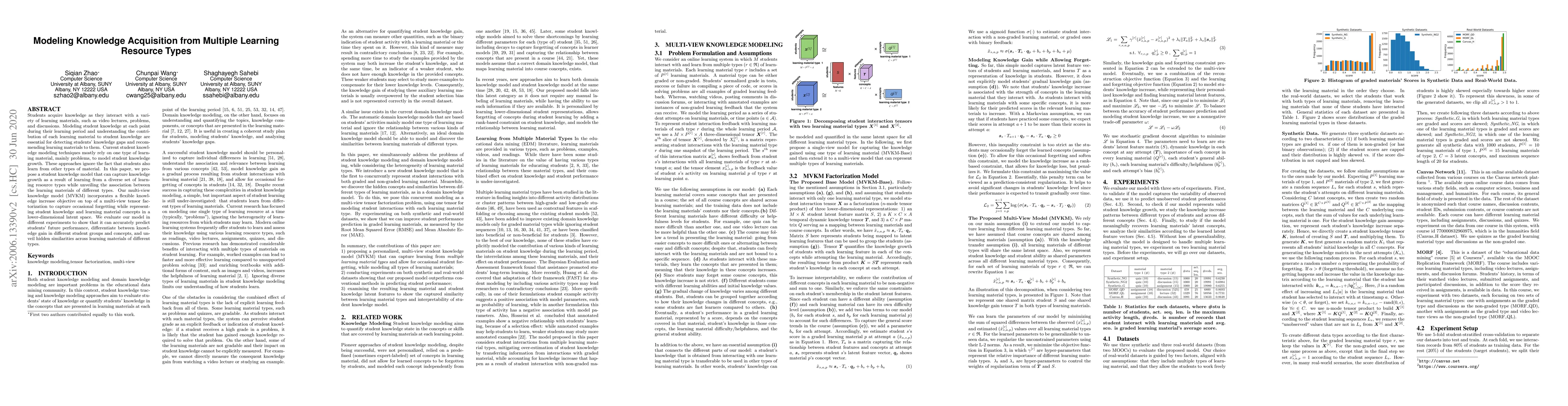 This research introduces the Multi-View Knowledge Model (MVKM) that captures student knowledge growth from diverse learning resources like video lectures, problems, and discussions. MVKM uses a tensor factorization method to represent knowledge and material concepts in a lower-dimensional space, accurately predicting performance and revealing similarities across different resource types.