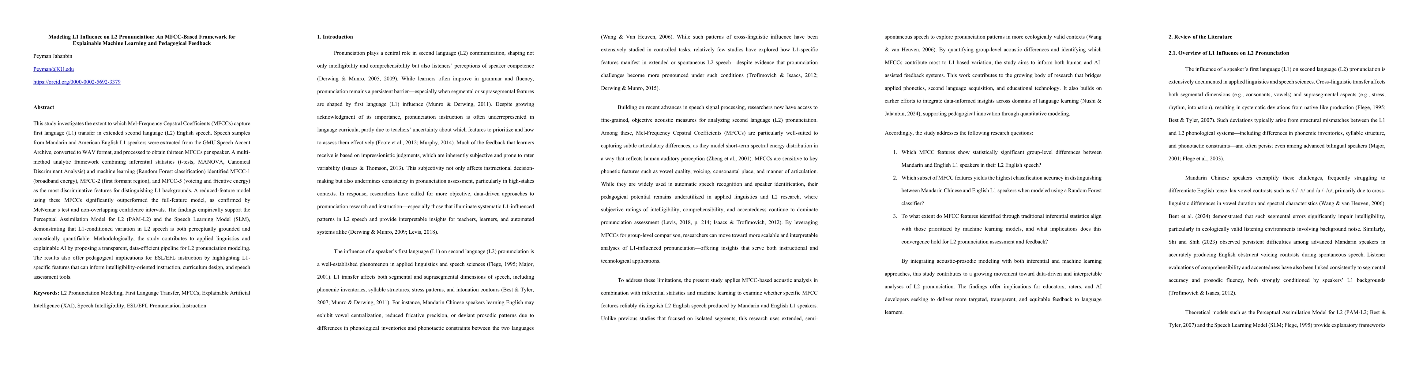 This study uses MFCC-based machine learning to model L1 influence on L2 English pronunciation, identifying MFCC-1, MFCC-2, and MFCC-5 as key features. The findings support theories of L2 speech perception and inform pedagogical strategies for effective ESL/EFL instruction.