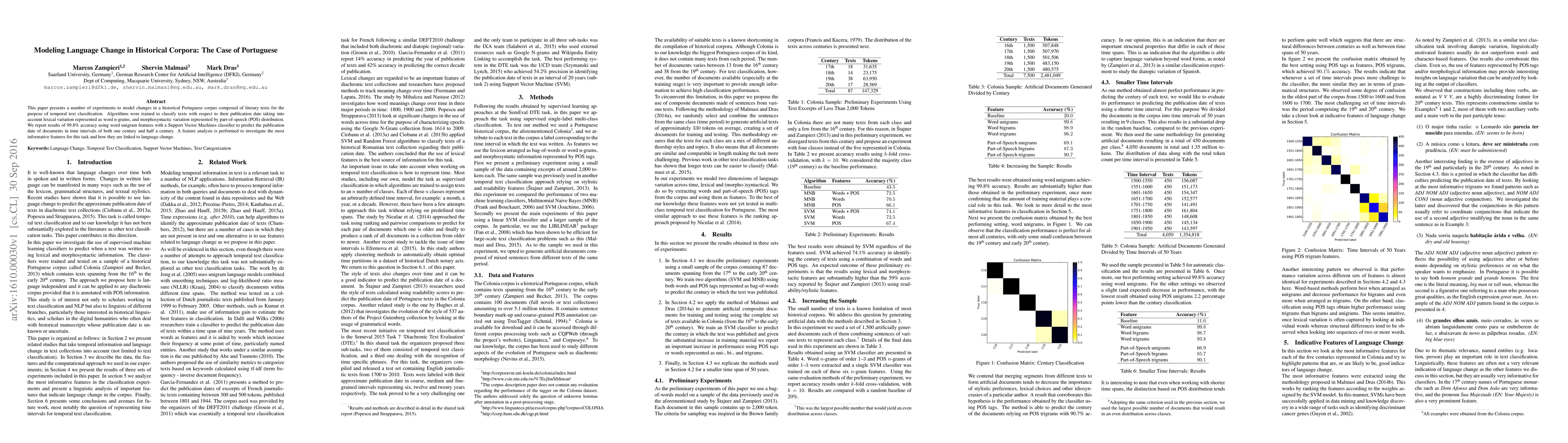 This paper models language change in historical Portuguese corpora using lexical and morphosyntactic features, achieving 99.8% accuracy in temporal text classification with SVMs, and identifies key features linked to language evolution.