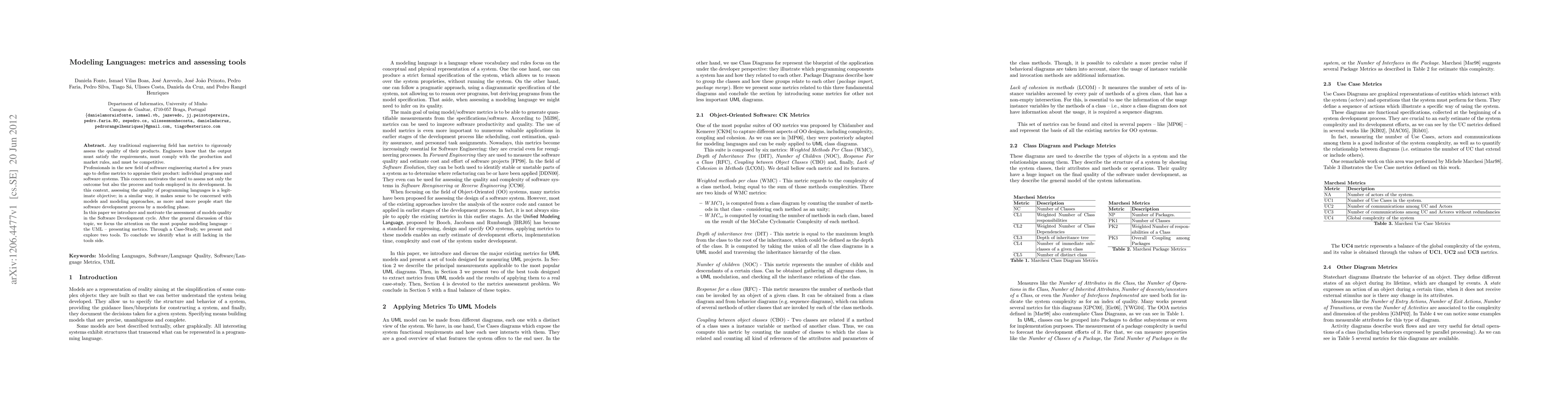 Any traditional engineering field has metrics to rigorously assess the quality of their products. Engineers know that the output must satisfy the requirements, must comply with the production and market rules, and must be competitive. Professionals in the new field of software engineering started a few years ago to define metrics to appraise their product: individual programs and software systems. This concern motivates the need to assess not only the outcome but also the process and tools employed in its development. In this context, assessing the quality of programming languages is a legitimate objective; in a similar way, it makes sense to be concerned with models and modeling approaches, as more and more people start the software development process by a modeling phase. In this paper we introduce and motivate the assessment of models quality in the Software Development cycle. After the general discussion of this topic, we focus the attention on the most popular modeling language -- the UML -- presenting metrics. Through a Case-Study, we present and explore two tools. To conclude we identify what is still lacking in the tools side.