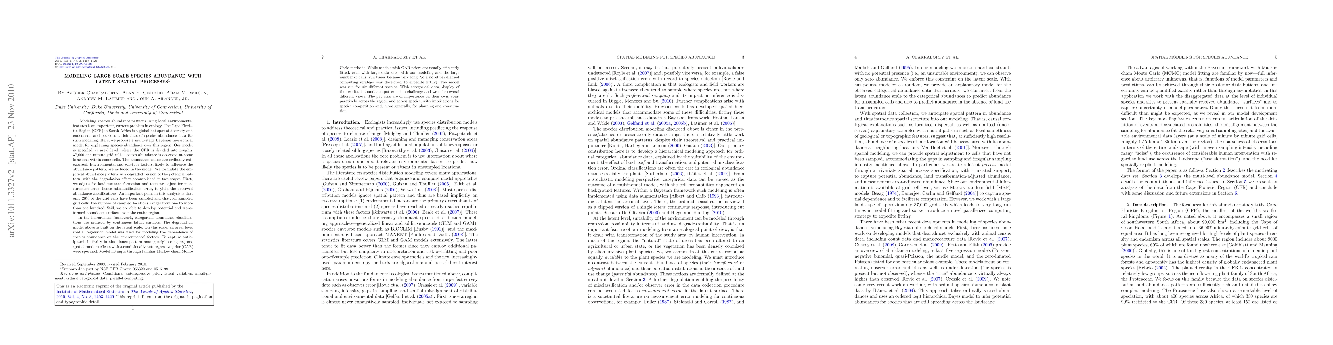Modeling species abundance patterns using local environmental features is an important, current problem in ecology. The Cape Floristic Region (CFR) in South Africa is a global hot spot of diversity and endemism, and provides a rich class of species abundance data for such modeling. Here, we propose a multi-stage Bayesian hierarchical model for explaining species abundance over this region. Our model is specified at areal level, where the CFR is divided into roughly $37{,}000$ one minute grid cells; species abundance is observed at some locations within some cells. The abundance values are ordinally categorized. Environmental and soil-type factors, likely to influence the abundance pattern, are included in the model. We formulate the empirical abundance pattern as a degraded version of the potential pattern, with the degradation effect accomplished in two stages. First, we adjust for land use transformation and then we adjust for measurement error, hence misclassification error, to yield the observed abundance classifications. An important point in this analysis is that only $28%$ of the grid cells have been sampled and that, for sampled grid cells, the number of sampled locations ranges from one to more than one hundred. Still, we are able to develop potential and transformed abundance surfaces over the entire region. In the hierarchical framework, categorical abundance classifications are induced by continuous latent surfaces. The degradation model above is built on the latent scale. On this scale, an areal level spatial regression model was used for modeling the dependence of species abundance on the environmental factors.