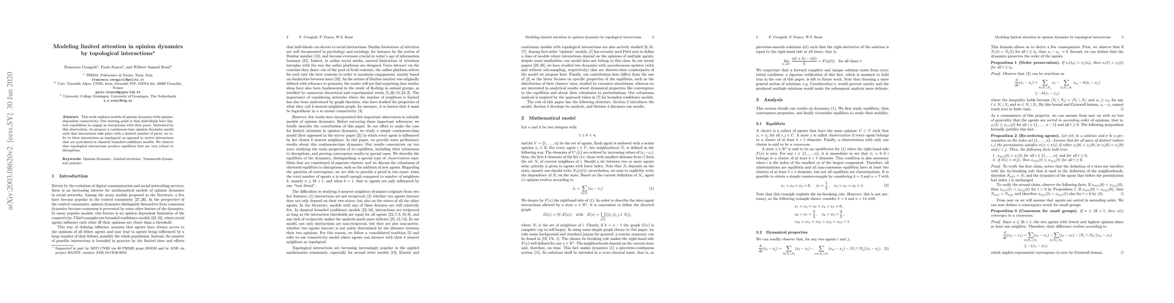 This paper proposes a continuous-time opinion dynamics model where individuals interact with a limited number of peers, termed topological interactions, due to their limited attention. These interactions yield robust equilibria, contrasting with classical metric interactions.