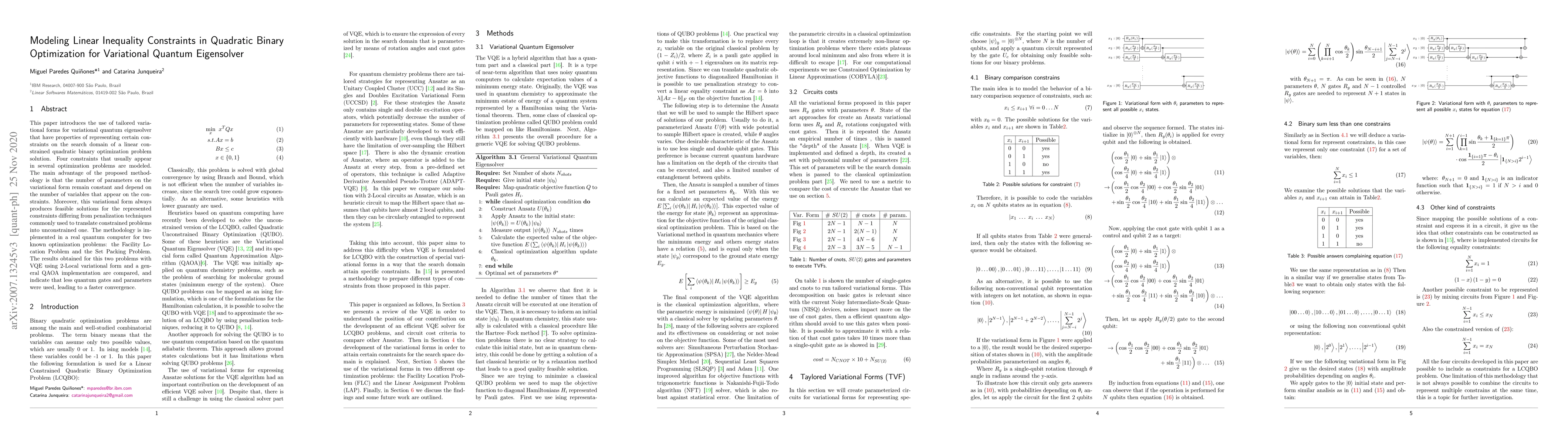 Researchers developed a new approach to solve linear inequality constraints in quadratic binary optimization problems using variational quantum eigensolver, reducing the number of parameters and gates needed for faster convergence.