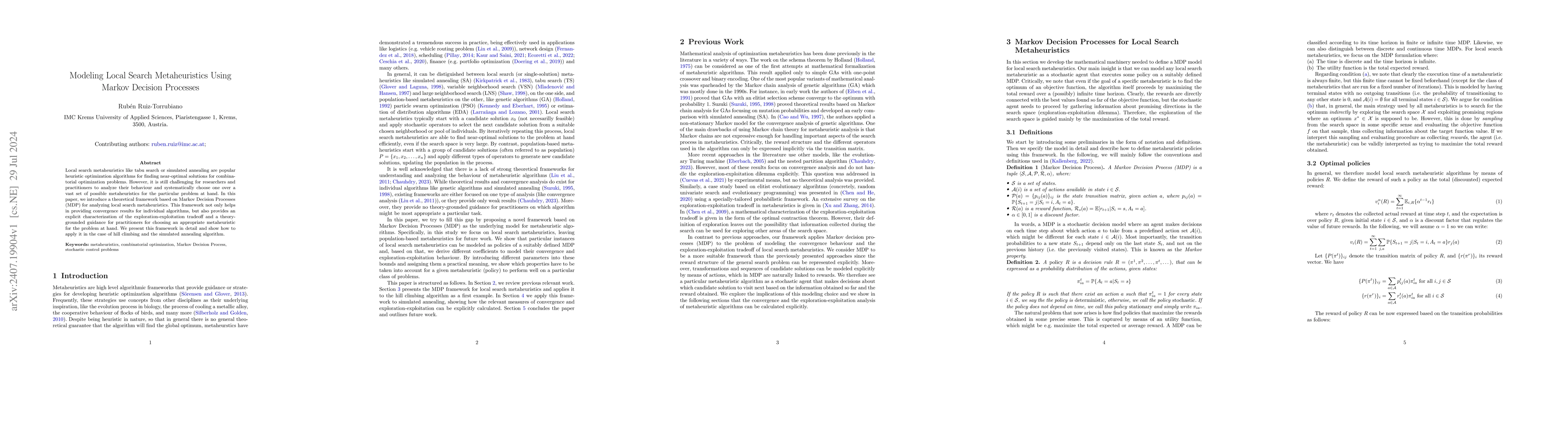This paper proposes a Markov Decision Process (MDP) framework for analyzing local search metaheuristics, enabling convergence analysis and guidance for selecting appropriate algorithms. It demonstrates the framework's application to hill climbing and simulated annealing.
