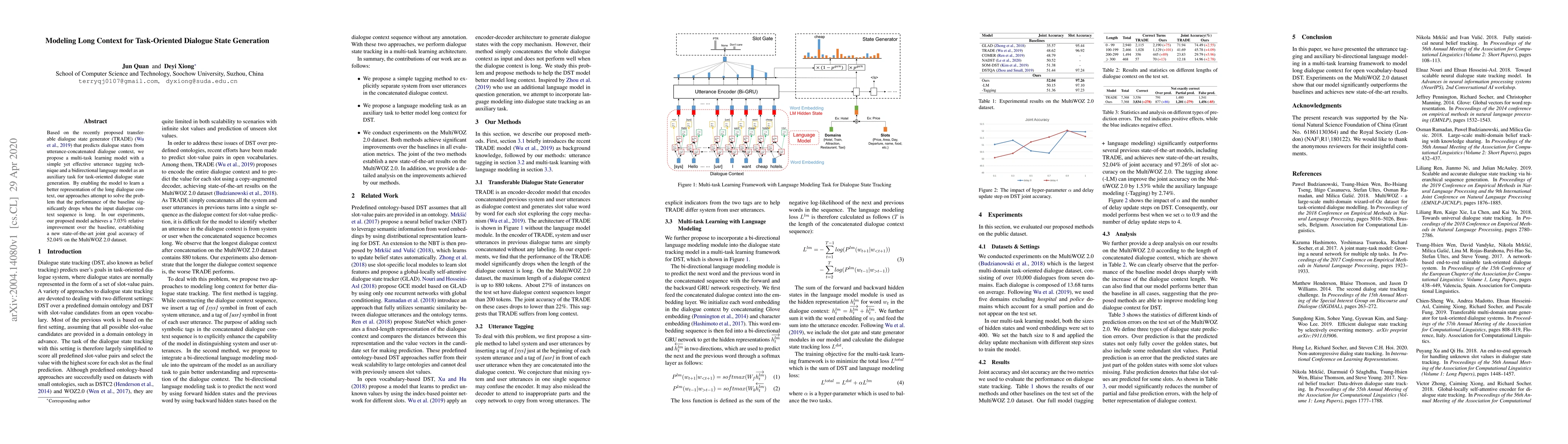 This paper proposes a multi-task learning model with an utterance tagging technique and a bidirectional language model to improve task-oriented dialogue state generation, especially for long contexts. The new model achieves a 7.03% relative improvement over the baseline, setting a new state-of-the-art with 52.04% joint goal accuracy on the MultiWOZ 2.0 dataset.