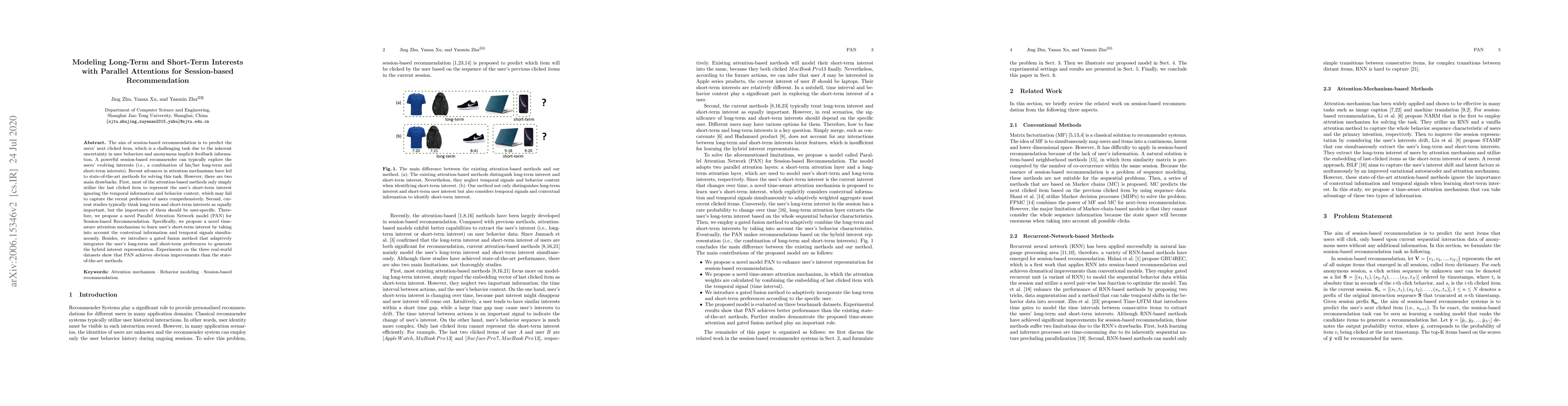The paper proposes a Parallel Attention Network (PAN) model for session-based recommendation, addressing the limitations of existing attention-based methods by incorporating a time-aware attention mechanism to capture short-term interests and a gated fusion method to adaptively integrate long-term and short-term interests. PAN outperforms state-of-the-art methods on three real-world datasets.