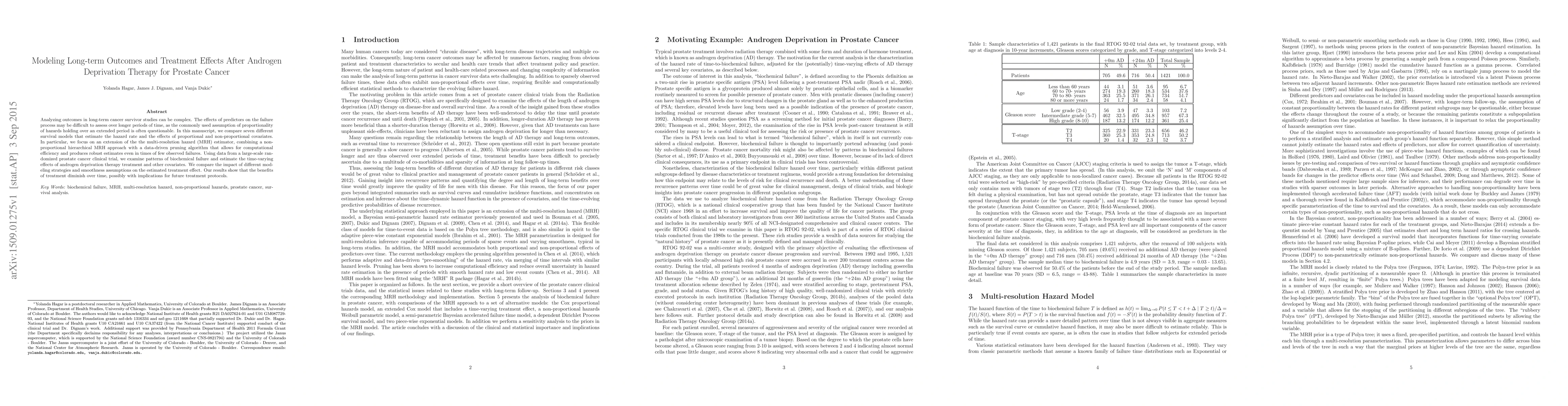 This study compares seven survival models to analyze long-term outcomes and treatment effects of androgen deprivation therapy for prostate cancer, finding that benefits of treatment diminish over time. The proposed non-proportional hierarchical multi-resolution hazard model, combined with a pruning algorithm, offers robust estimates and highlights the importance of considering time-varying effects in treatment protocols.