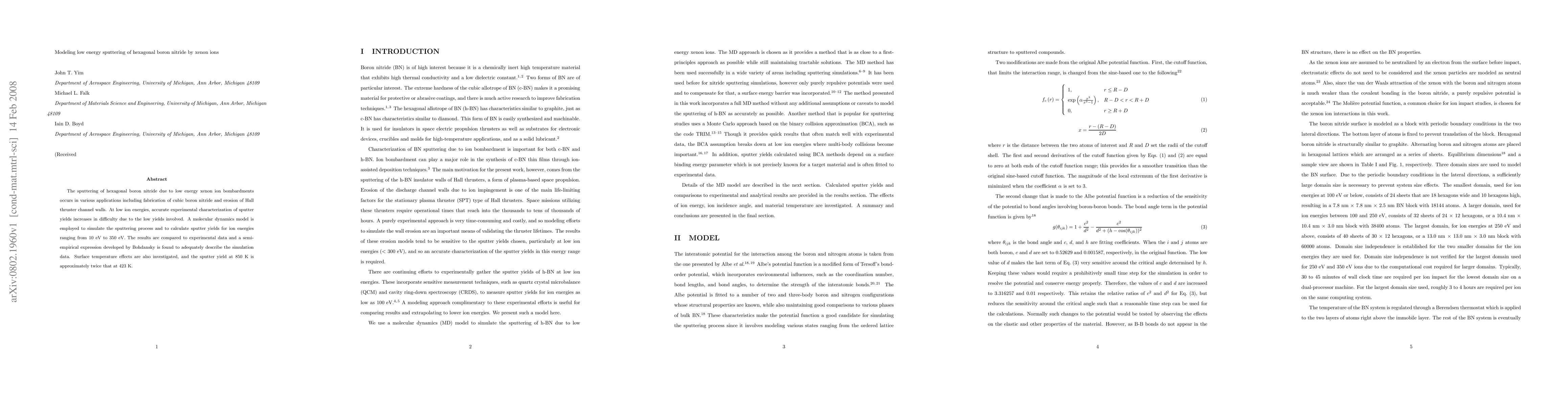 This paper uses molecular dynamics simulations to model the sputtering of hexagonal boron nitride by low-energy xenon ions, finding that a semi-empirical expression by Bohdansky fits the simulation data well. The study also reveals that the sputter yield doubles when the surface temperature increases from 423 K to 850 K.