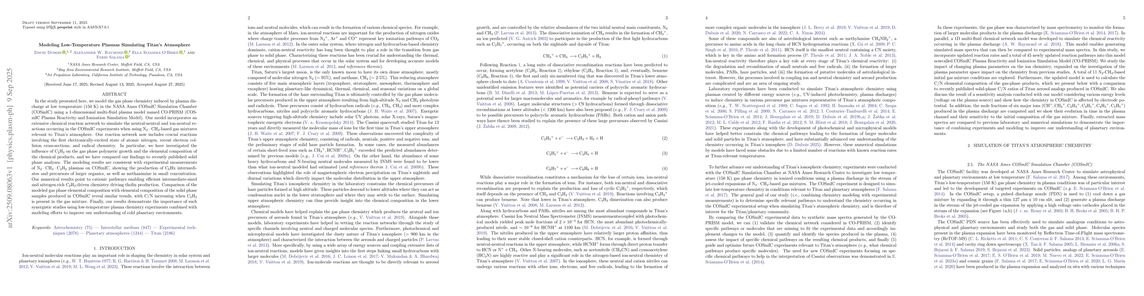 In the study presented here, we model the gas phase chemistry induced by plasma discharge at low temperature (150 K) in the NASA Ames COSmIC Simulation Chamber (COSmIC) using a 1-dimensional multi-fluid plasma model named CO-PRISM (COSmIC Plasma Reactivity and Ionization Simulation Model). Our model incorporates an extensive chemical reaction network to simulate the neutral-neutral and ion-neutral reactions occurring in the COSmIC experiments when using N2-CH4-based gas mixtures relevant to Titan's atmosphere. Our reaction network now includes crucial reactions involving the first electronically-excited state of atomic nitrogen, recent electron collision cross-sections, and radical chemistry. In particular, we have investigated the influence of C2H2 on the gas phase polymeric growth and the elemental composition of the chemical products, and we have compared our findings to recently published solid phase analyses. The modeling results are consistent with experimental measurements of N2-CH4-C2H2 plasmas on COSmIC, showing the production of C6Hx intermediates and precursors of larger organics, as well as methanimine in small concentration. Our numerical results point to cationic pathways enabling efficient intermediate-sized and nitrogen-rich \ce{C2H2}-driven chemistry driving tholin production. Comparison of the modeled gas phase elemental composition with elemental composition of the solid phase samples produced in COSmIC reveal similar trends, with C/N increasing when C2H2 is present in the gas mixture. Finally, our results demonstrate the importance of such synergistic studies using low-temperature plasma chemistry experiments combined with modeling efforts to improve our understanding of cold planetary environments.
