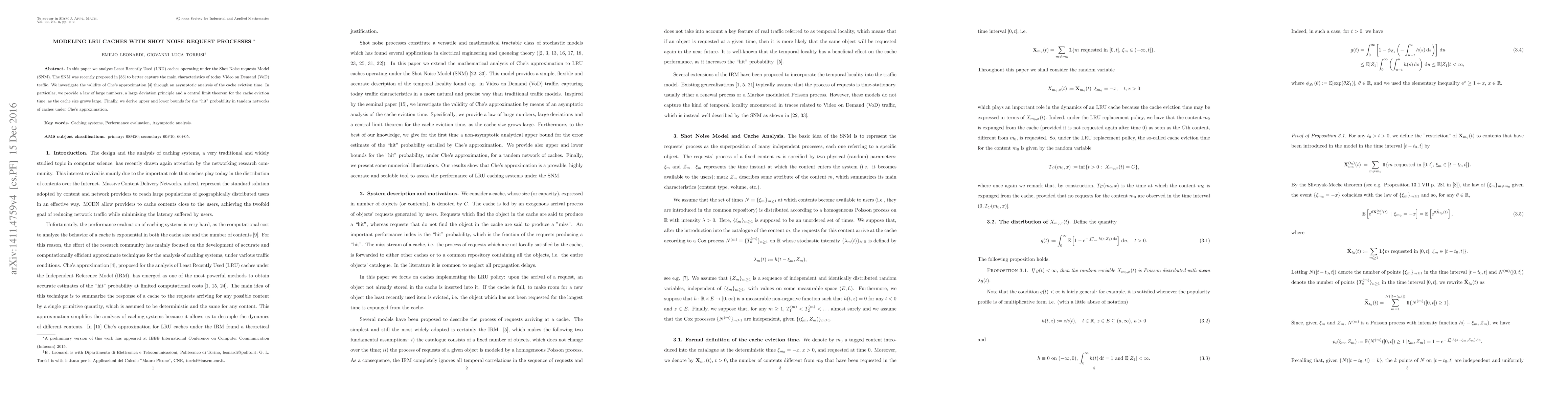 This paper analyzes LRU caches under Shot Noise requests Model to provide a large deviation principle, law of large numbers, and central limit theorem for cache eviction time, offering upper and lower bounds for the 'hit' probability in tandem networks of caches.