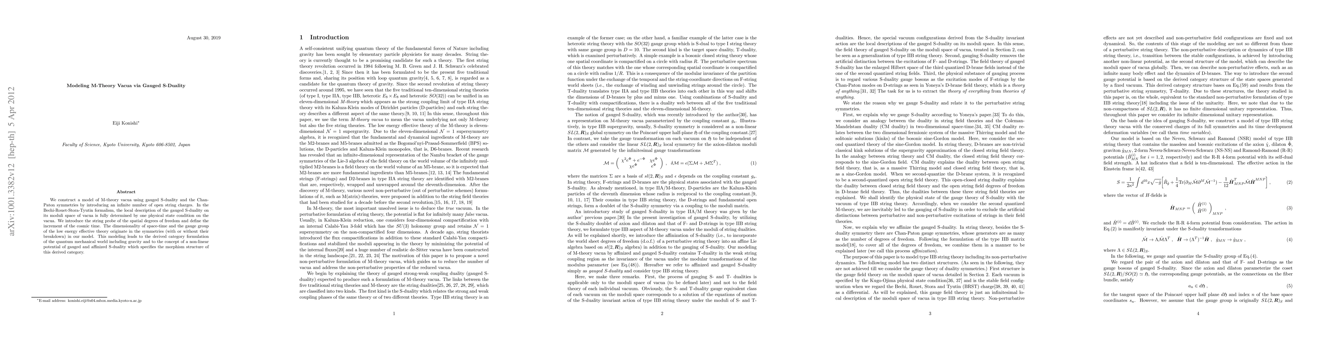 We construct a model of M-theory vacua using gauged S-duality and the Chan-Paton symmetries by introducing an infinite number of open string charges. In the Bechi-Rouet-Stora-Tyutin formalism, the local description of the gauged S-duality on its moduli space of vacua is fully determined by one physical state condition on the vacua. We introduce the string probe of the spatial degrees of freedom and define the increment of the cosmic time. The dimensionality of space-time and the gauge group of the low energy effective theory originate in the symmetries (with or without their breakdown) in our model. This modeling leads to the derived category formulation of the quantum mechanical world including gravity and to the concept of a non-linear potential of gauged and affinized S-duality which specifies the morphism structure of this derived category.