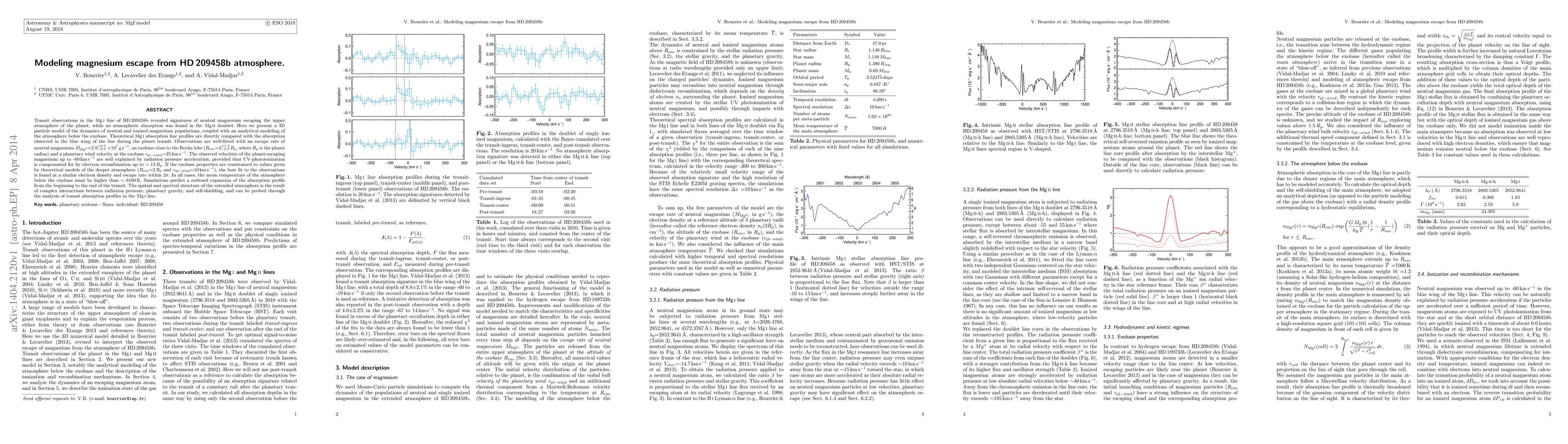 Researchers used a 3D particle model to study magnesium escape from HD209458b's atmosphere during transit, finding an escape rate of 2x10^7-3.4x10^7 g/s and a temperature above 6100 K below the exobase.
