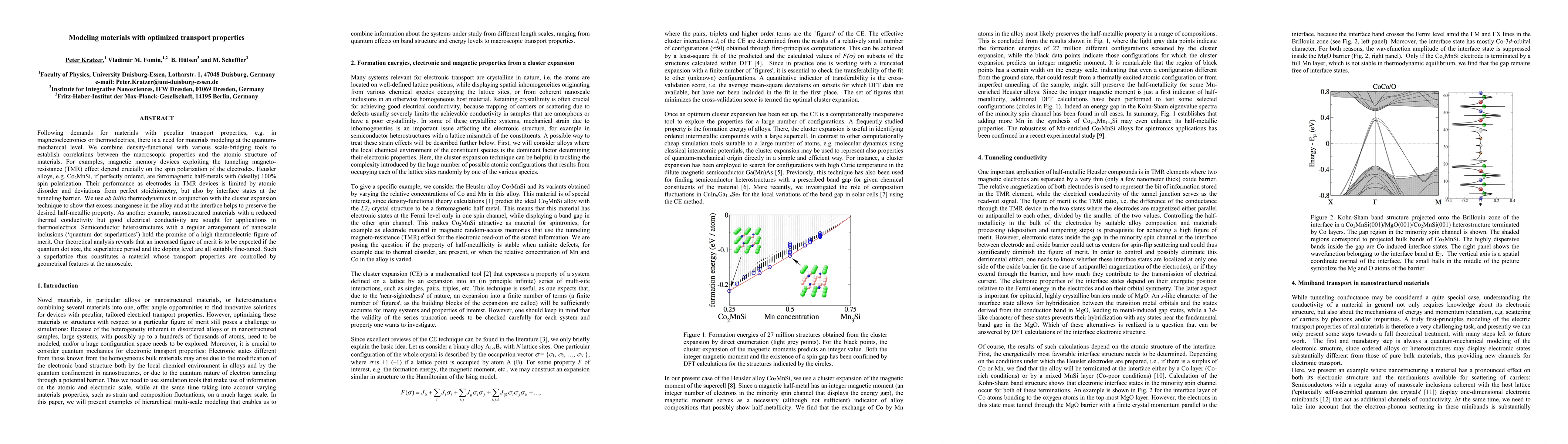 Following demands for materials with peculiar transport properties, e.g. in magnetoelectronics or thermoelectrics, there is a need for materials modeling at the quantum-mechanical level. We combine density-functional with various scale-bridging tools to establish correlations between the macroscopic properties and the atomic structure of materials. For examples, magnetic memory devices exploiting the tunneling magneto-resistance (TMR) effect depend crucially on the spin polarization of the electrodes. Heusler alloys, e.g. Co2MnSi, if perfectly ordered, are ferromagnetic half-metals with (ideally) 100% spin polarization. Their performance as electrodes in TMR devices is limited by atomic disorder and deviations from perfect stoichiometry, but also by interface states at the tunneling barrier. We use ab initio thermodynamics in conjunction with the cluster expansion technique to show that excess manganese in the alloy and at the interface helps to preserve the desired half-metallic property. As another example, nanostructured materials with a reduced thermal conductivity but good electrical conductivity are sought for applications in thermoelectrics. Semiconductor heterostructures with a regular arrangement of nanoscale inclusions ('quantum dot superlattices') hold the promise of a high thermoelectric figure of merit. Our theoretical analysis reveals that an increased figure of merit is to be expected if the quantum dot size, the superlattice period and the doping level are all suitably fine-tuned. Such a superlattice thus constitutes a material whose transport properties are controlled by geometrical features at the nanoscale.