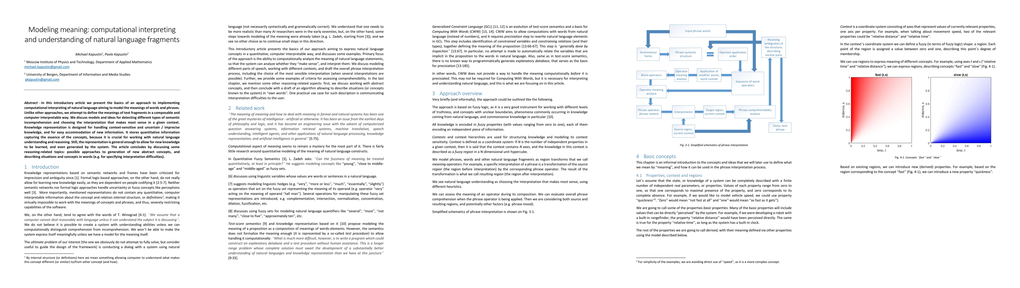 In this introductory article we present the basics of an approach to implementing computational interpreting of natural language aiming to model the meanings of words and phrases. Unlike other approaches, we attempt to define the meanings of text fragments in a composable and computer interpretable way. We discuss models and ideas for detecting different types of semantic incomprehension and choosing the interpretation that makes most sense in a given context. Knowledge representation is designed for handling context-sensitive and uncertain / imprecise knowledge, and for easy accommodation of new information. It stores quantitative information capturing the essence of the concepts, because it is crucial for working with natural language understanding and reasoning. Still, the representation is general enough to allow for new knowledge to be learned, and even generated by the system. The article concludes by discussing some reasoning-related topics: possible approaches to generation of new abstract concepts, and describing situations and concepts in words (e.g. for specifying interpretation difficulties).